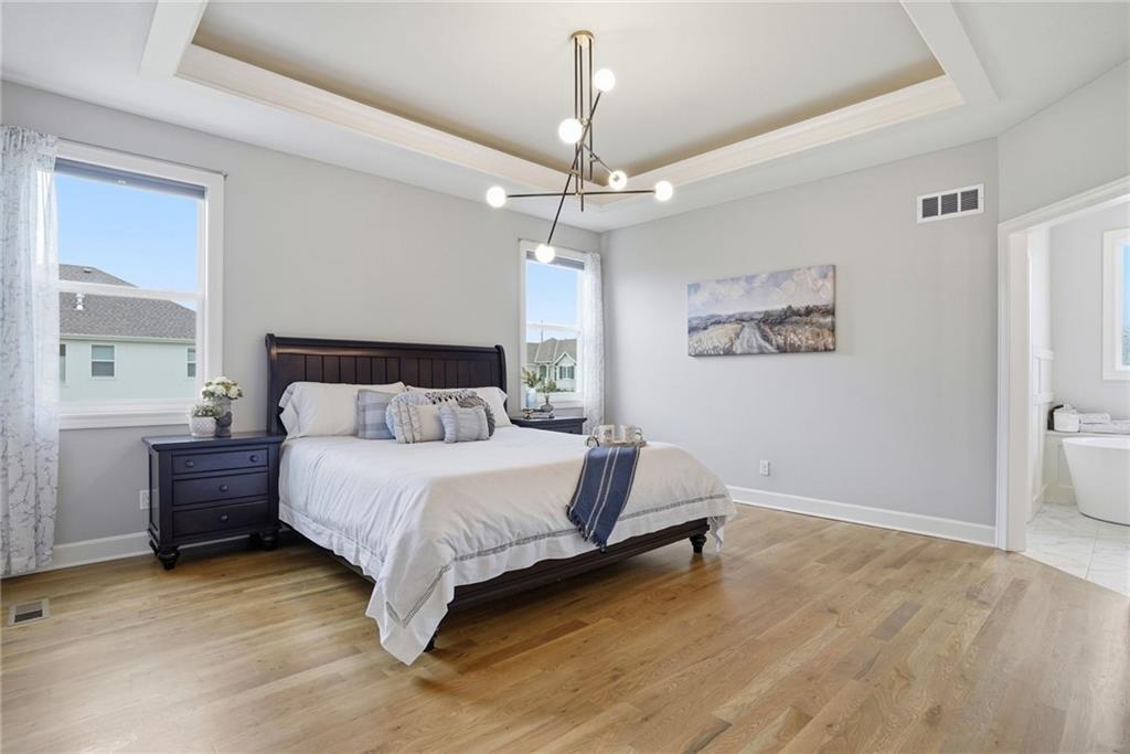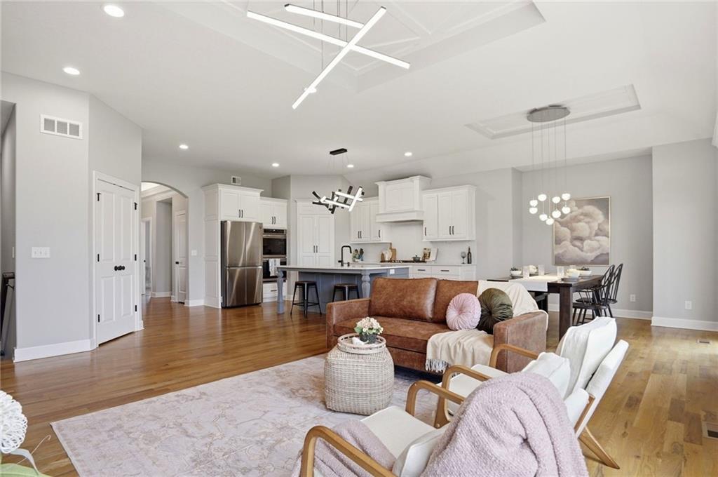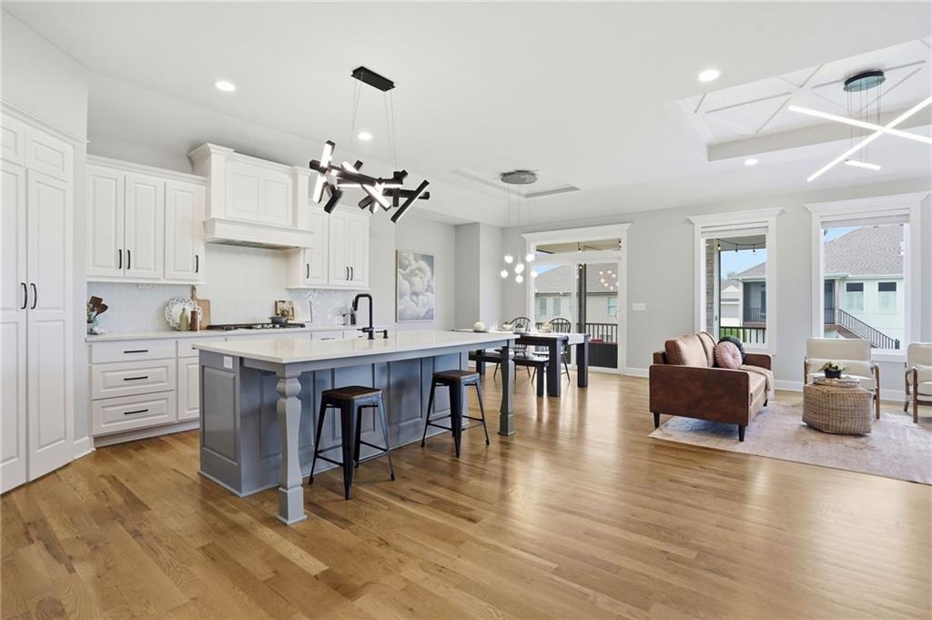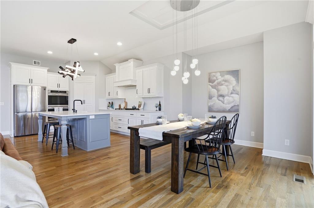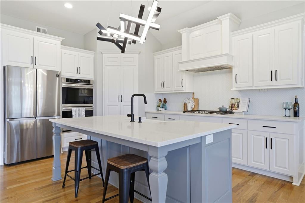 Welcome to your next neighborhood! Brookwood Farms is a vibrant, warm, welcoming, and social community with a pool, playground, fishing pond, and walking trails. Welcome to your next home! A rare opportunity to own a home featuring a 4 car garage — perfect for the car collector, hobbyist, boat owner (Hillsdale Lake is just 16 minutes!), or anyone needing expansive garage space. Whether you’re storing classic cars, creating a workshop, or keeping recreational vehicles and equipment protected, this home's garage offers incredible flexibility and room to spare. Inside this reverse 1.5 story home, find a spacious open floor plan designed for comfortable living and entertaining along with 4 bedrooms and 3 full bathrooms; providing plenty of room for you, your family and/or guests. Every detail considered! This home stands out from others with it's first impression curb appeal of the white & black modern farm-house style, to 4 frosted glass panel garage doors, to interior upgraded features that you will love - dramatic barrel-vault entry hall, arched openings, stainless steel double ovens and gas range, farmhouse style sink in large kitchen island, granite counter tops, shiplap feature wall framing the living room fireplace, boxed ceiling in primary bedroom, free-standing soaker tub in ensuite, walk-in shower, modern light fixtures, and soft backlighting throughout. Step outside to take-in sunrise over the neighborhood pond or the sunset as the day winds down, all from the screened-in covered deck with stone fireplace which creates a cozy outdoor living space you can use year-round. A rare combination of functional living space and an exceptional garage/workshop setup that’s increasingly hard to find. This home truly has it all in the fastest growing residential community of Spring Hill, Kansas!