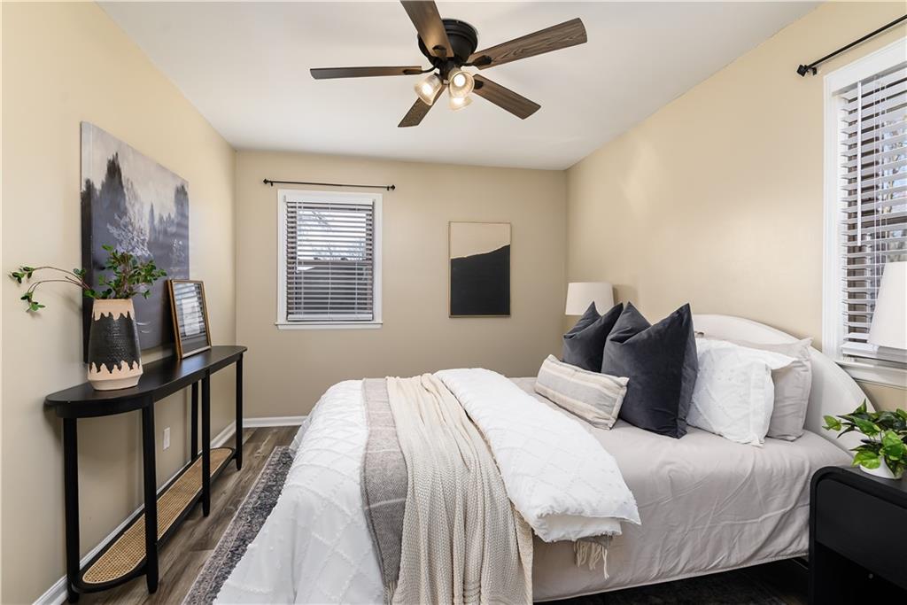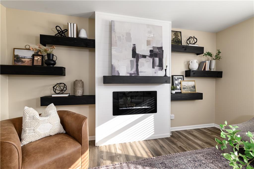 Beautifully updated home located on a quiet dead-end street just minutes from Fort Leavenworth! The upper level features a spacious living room with electric fireplace and built-in shelving, a kitchen with painted cabinets and butcher block countertops, eat-in dining area, three bedrooms, and a full bath. The lower level offers a primary suite with private full bath, walk-in closet, and newer windows. Step outside to enjoy the double-tiered deck, with one level covered, overlooking a privacy-fenced backyard—perfect for relaxing or entertaining. Additional features include a two-car garage with smart openers, extra parking pad, newer flooring throughout, updated plumbing and light fixtures, remote-controlled ceiling fans, faux wood blinds, whole house humidifier, newer concrete front steps with handrail! This Leavenworth CHARMER is move-in ready!