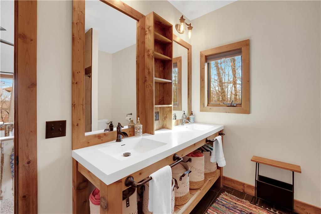 Indulge in waterfront living on approximately 5 serene acres at the 75 mile marker of Lake of the Ozarks. This custom-built home seamlessly blends luxury, Amish craftsmanship, and natural beauty, offering 4 bedrooms and 3.5 bathrooms designed for comfort and style. Very economical to heat and cool with geothermal system. Step into the open-concept main living area, where soaring vaulted wood ceilings with exposed beams, rich wood flooring, and walls of windows frame breathtaking views of the surrounding landscape. The gourmet kitchen is a chef’s dream, featuring a 9-foot island with seating, quartz countertops, custom cabinetry, mosaic tile backsplash, stainless steel appliances, and a walk-in pantry. Focus on work in your own home office or Relax in the sunroom or step outside to enjoy the expansive deck that spans the back of the home—perfect for entertaining—and a cozy firepit for relaxing evenings. The lower level hosts a finished game room with a regulation-size pool table included, two bedrooms, and a full bathroom, along with ample storage and a mechanical room housing a geothermal HVAC system, water heaters, and water filtration system. The property boasts approximately 110 feet of waterfront with an electric tram to a private two-slip covered dock equipped with boat lifts, a swim platform with Wet Steps, and a stainless steel fish cleaning station (Ameren permitted). Nestled in the gated Forbes Lake of the Ozarks Park community, enjoy privacy, road maintenance, and access to shared amenities—all while embracing the ultimate lakefront lifestyle.