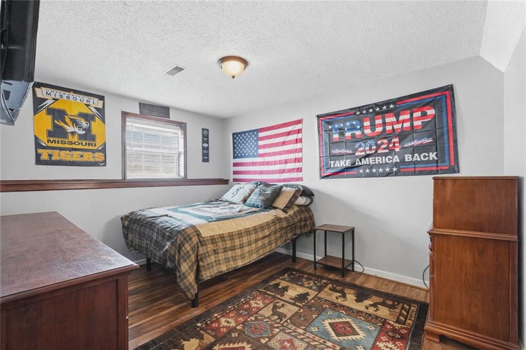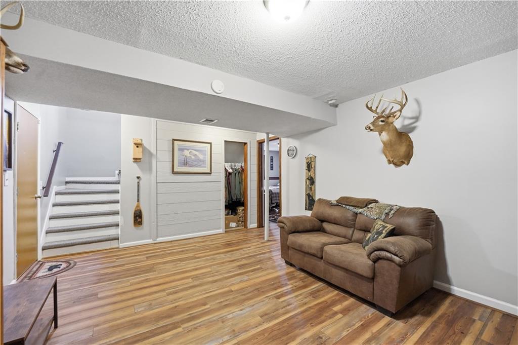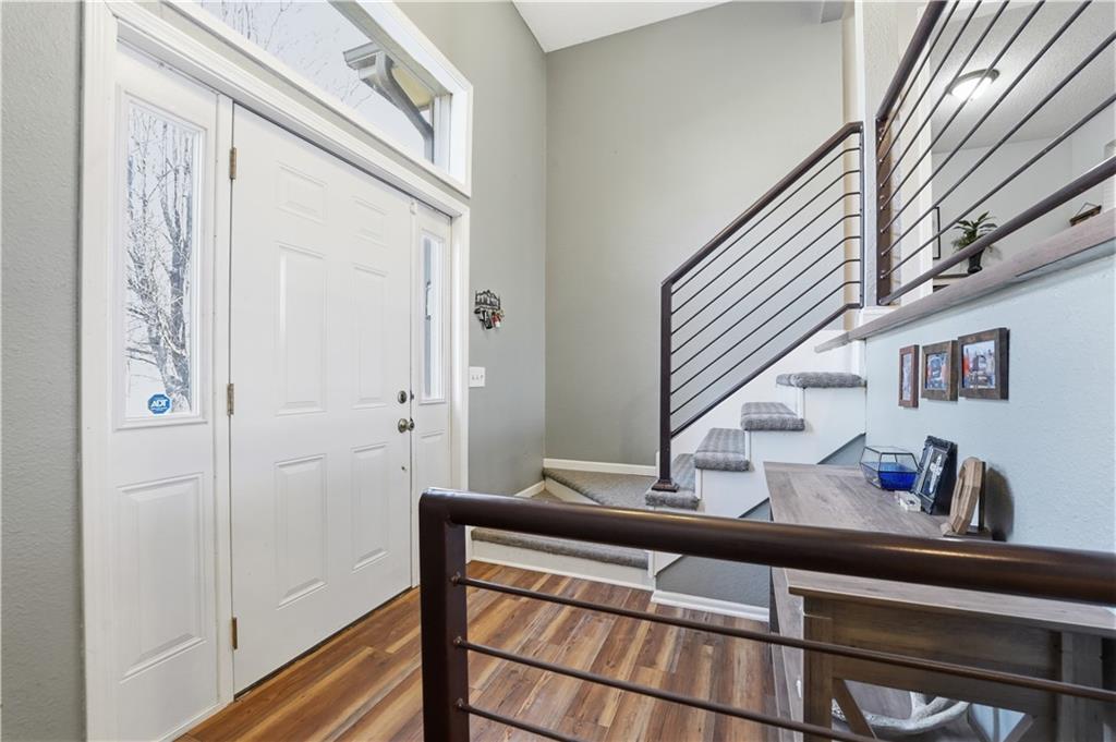 Situated on a peaceful cul-de-sac lot, this inviting split-entry home welcomes you with a spacious entryway accented by elegant iron railings. Step inside to discover laminate plank flooring throughout, adding modern style. The living room features a cozy fireplace with new electric insert, ceiling fan, and sleek iron railing that enhances the open, streamlined feel of the space. Updated eat in kitchen that walks out to a covered deck. The primary bedroom features a decorative box ceiling, ceiling fan, and a large walk-in closet, along with the convenience of an adjoining private bath. Laundry is located on the bedroom level. The finished lower level offers a spacious family room and a fourth bedroom featuring a stylish painted plank accent wall and attached bath. Large fenced backyard with covered deck and a paver patio surrounded by established trees.