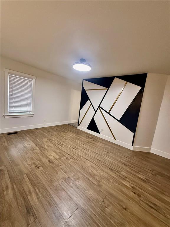Unfurnished living room featuring light wood-type flooring and baseboards