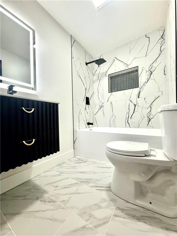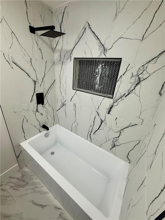 Bathroom with vanity, light marble finish flooring, and a combined bath / shower with marble appearance