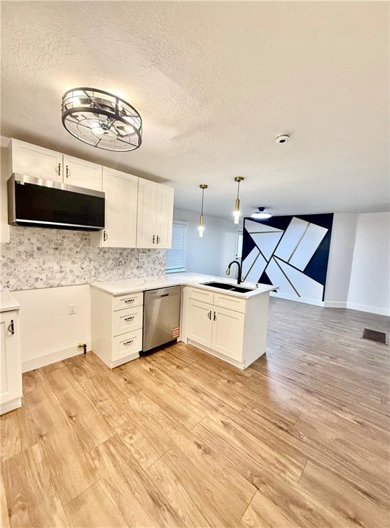Kitchen with a peninsula, stainless steel appliances, white cabinets, pendant lighting, and a textured ceiling
