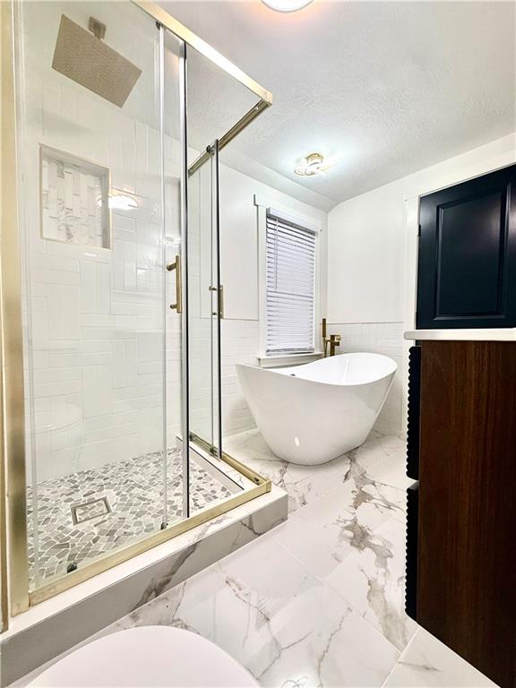Primary Bathroom featuring vanity, light marble finish floors, a freestanding bath, a shower stall, and a textured ceiling