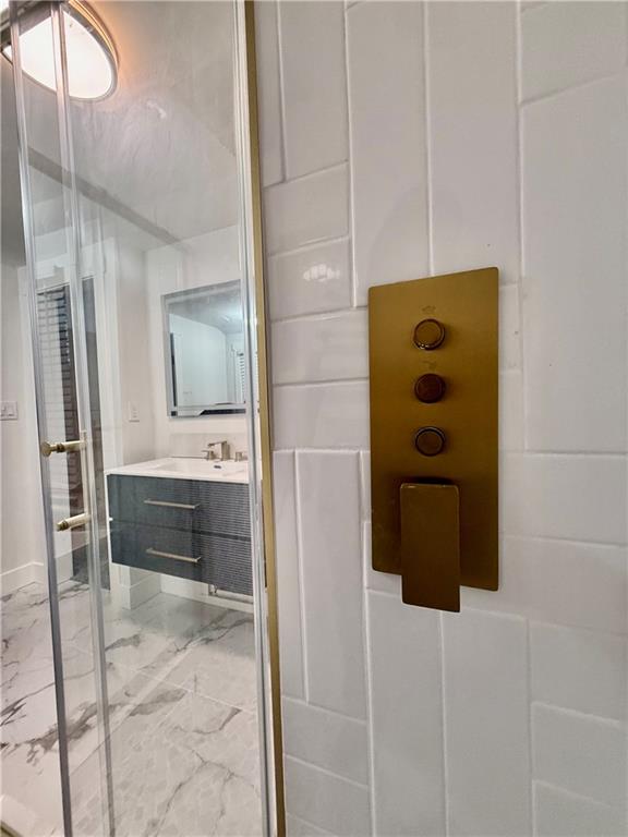 Primary bath with vanity, light marble finish flooring, and a stall shower