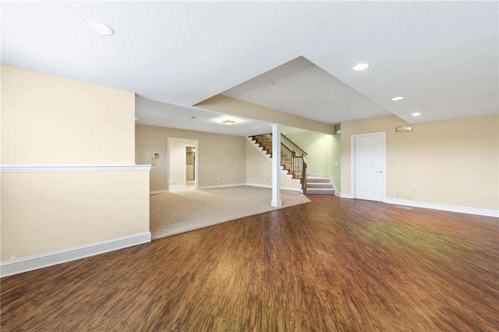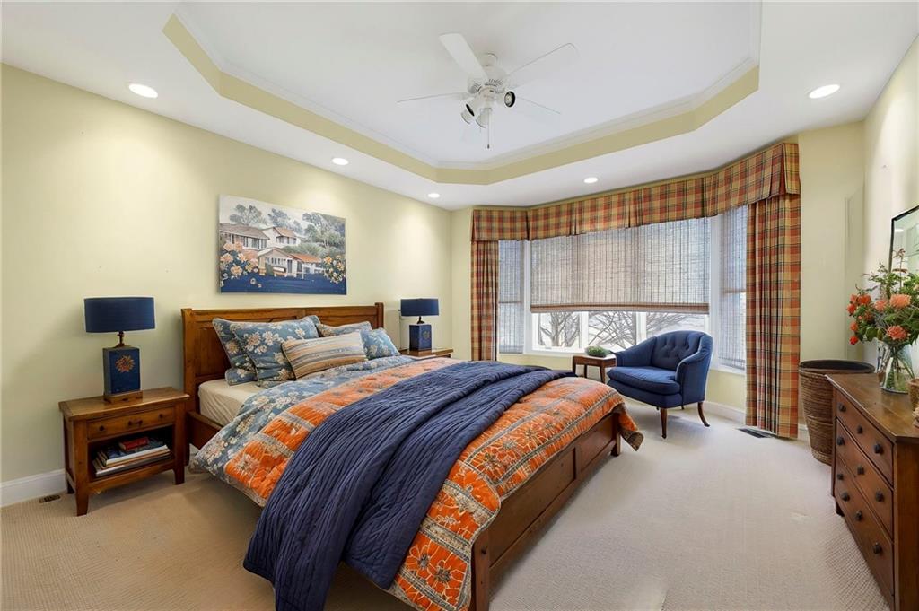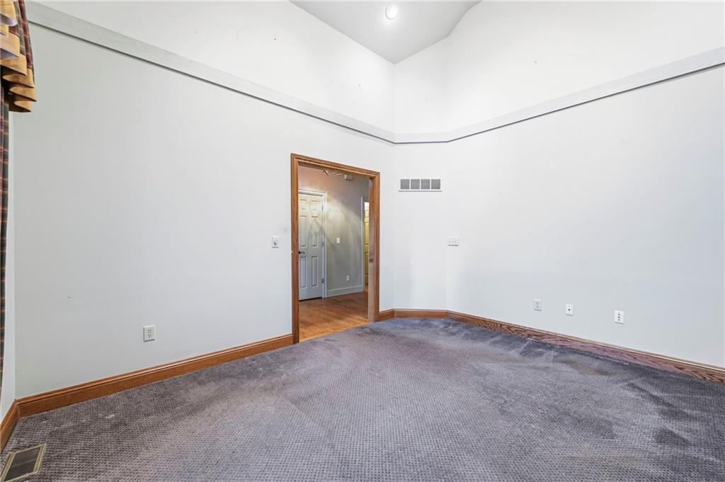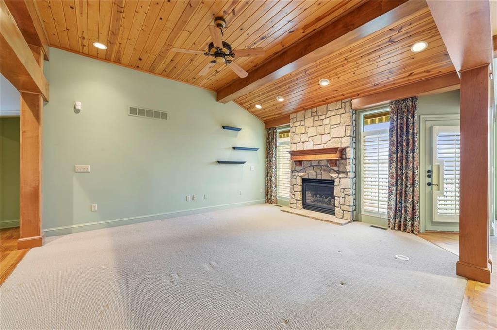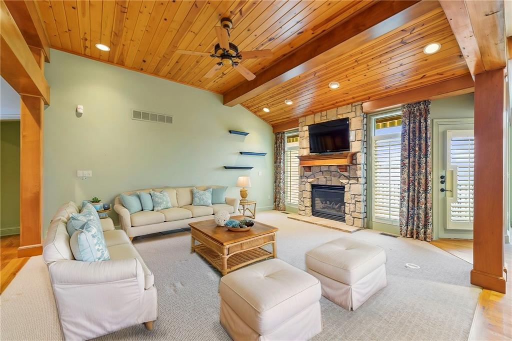 Stunning Custom Reverse 1.5-Story in Highland Crest with Falcon Valley Golf Course Views This beautifully custom designed and built reverse 1.5-story home in sought-after Highland Crest offers privacy, exceptional craftsmanship, and scenic views of Falcon Valley Golf Course. The professionally landscaped lot features mature trees, manicured shrubs, raised garden beds, and a tranquil waterfall water feature. With no neighbors behind, the property backs to open space, creating a peaceful and private outdoor setting. The striking all-stucco exterior with elegant natural stone accents provides outstanding curb appeal. Inside, the thoughtfully designed floor plan showcases rich hardwood floors, exposed wood beams, and tongue-and-groove wood ceilings that add warmth and character throughout the main living spaces. The chef’s kitchen features beautiful stained cabinetry, quartz countertops, stainless steel appliances, a spacious dining area and a large walk-in pantry—perfect for both everyday living and entertaining. A private office provides a quiet work-from-home space. The main-level primary suite offers a relaxing retreat with a large walk-in shower with seamless glass and an expansive walk-in closet with custom built-ins. A convenient half bathroom and main-floor laundry room completes the level. The daylight lower level is ideal for entertaining and recreation, with enough room to add a 4th bedroom and featuring a spacious rec room with luxury vinyl flooring, a dedicated area for a pool table, two additional bedrooms, and a full bathroom. There is also abundant storage space, along with updated High Efficiency HVAC and a High End whole-home water filtration system. Step outside to enjoy the newer composite deck and additional patio overlooking the large, treed backyard that backs to open space. Located within easy walking distance to the neighborhood pool and just minutes from Lenexa City Center, shopping, dining, and highways. highly regarded Olathe Schools