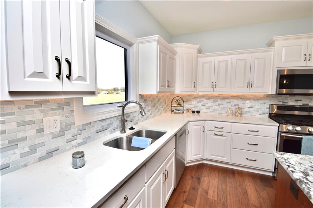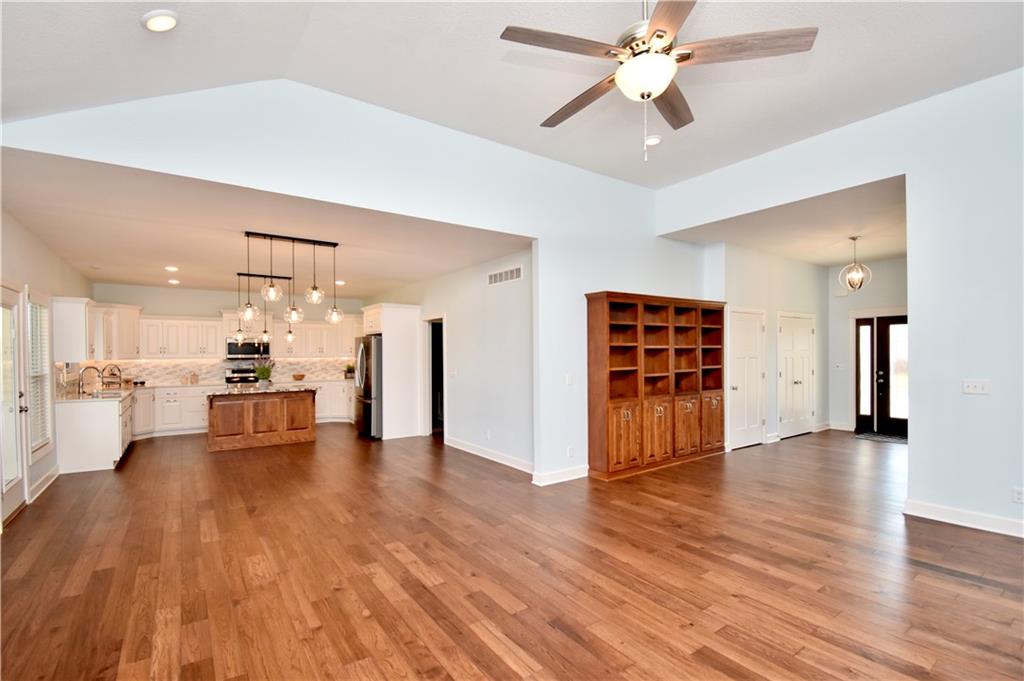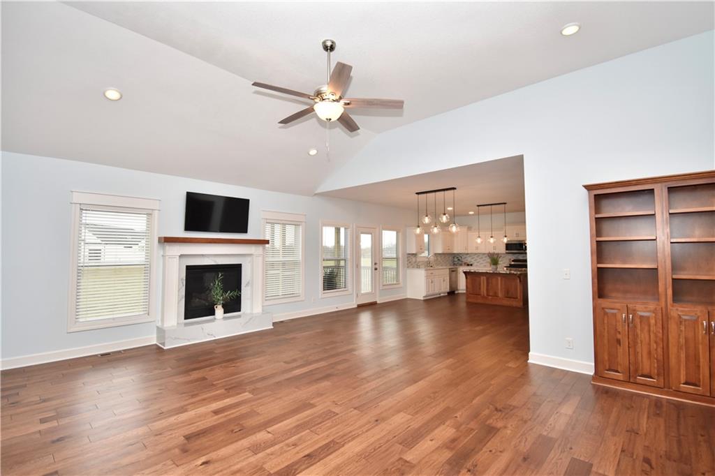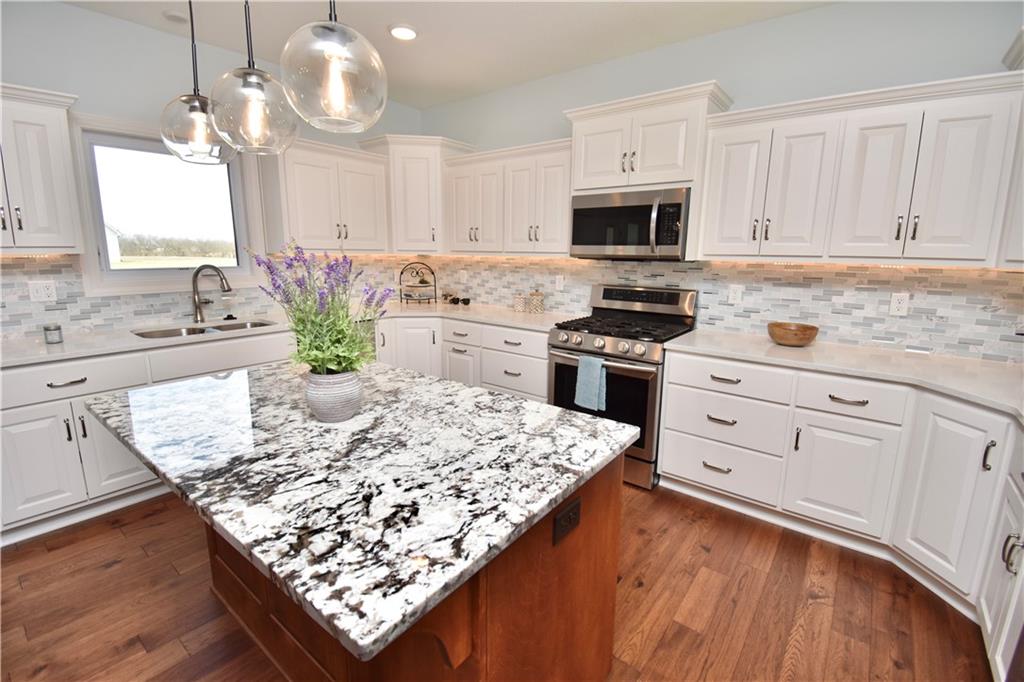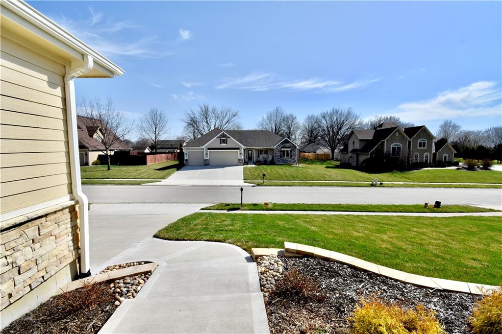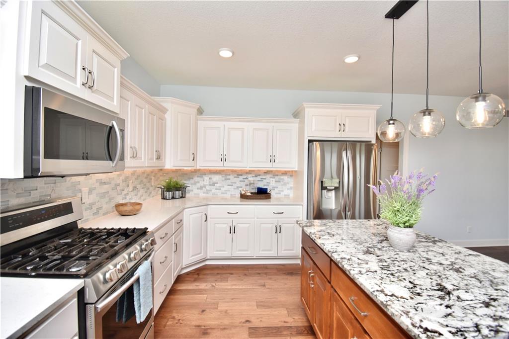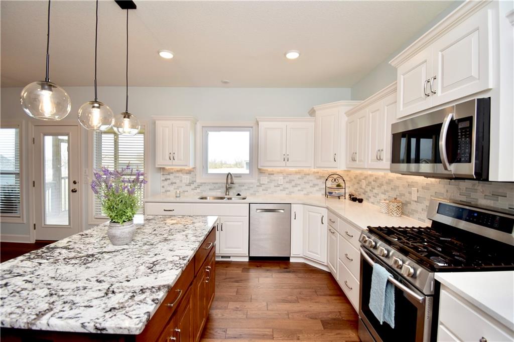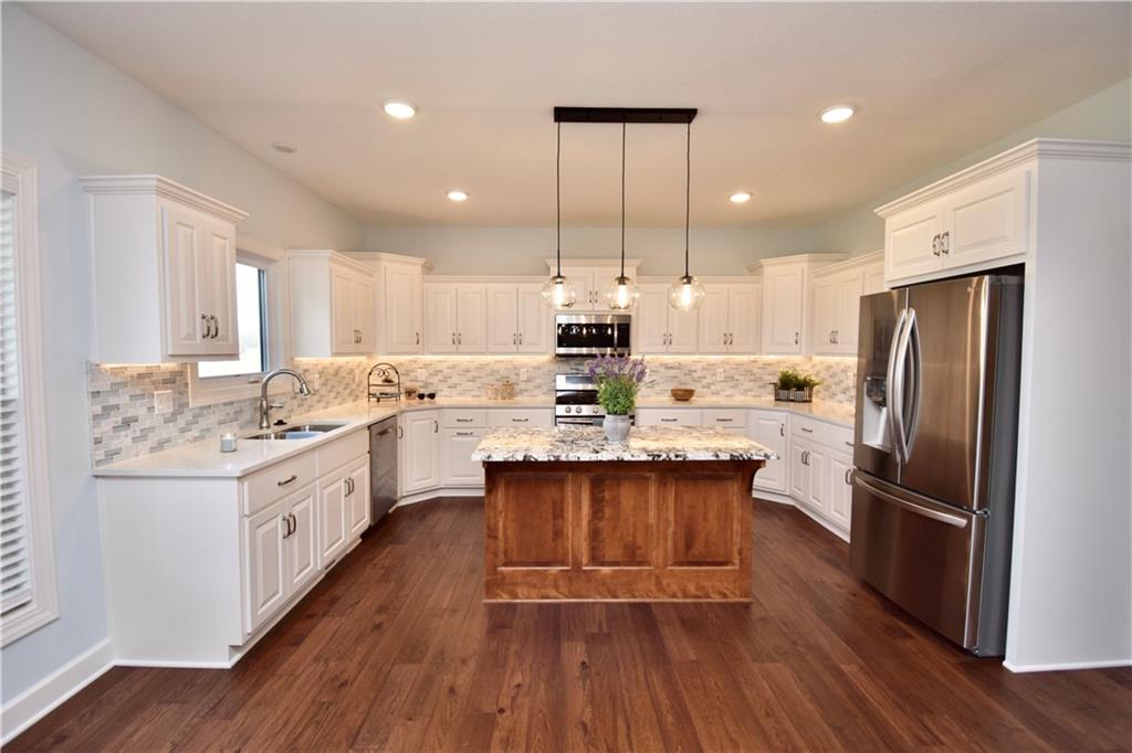 Beautiful custom-built reverse ranch with an open floor plan, meticulously maintained by the original owner. You’ll know this home is special when entering through the beautiful front door! The main level offers over 2,000 sq ft with three bedrooms on the main floor. Attractive landscaping, retaining wall, and welcoming front porch provide great curb appeal. Inside, you’ll find beautiful wood flooring throughout the living room, kitchen, dining area, entry, and third bedroom. The third bedroom features wide French doors and was previously used as a piano room for a baby grand, and closet. The kitchen is a standout with granite countertops, an abundance of painted cabinetry, pull outs, w/4 lazy susan spindals, gas stove, stainless steel appliances, large walk-in pantry, spacious laundry room w/sink and built-ins, and mud area. The living room features a fireplace, built-in shelving, and plenty of space for flexible furniture arrangement. The primary suite includes a large walk-in tiled shower with seat, tiled flooring, double vanity, and walk-in closet. The second full bath offers tiled flooring and natural light from a window. The finished lower level features a huge recreation room with a lighted play nook area, two large bedrooms with oversized closets, and a full tiled bathroom. There is also plenty of unfinished space, including an excavated storage area beneath the front porch. Additional highlights include upgraded carpet on both the main and lower levels, a screened-in porch off the kitchen, upgraded lighting package, and taller ceilings in garage and one side tandem with a side service door and sidewalk to the front yard. The lot offers nice spacing between neighboring homes with views acreage. Seller meticulously took care of this home, truly better than new! Conveniently located near Lawson Lake, parks, and a golf course!