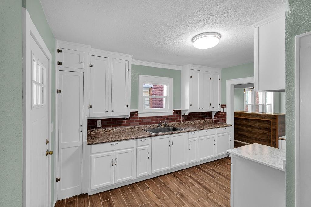 Fully renovated craftsman bungalow with charming curb appeal and thoughtful updates throughout! The covered front porch, gray lap siding, brick columns, and stone foundation give this home a classic look with fresh finishes. Step inside to find LVP flooring, dark crown molding, and recessed lighting throughout the main living areas. The living room features a brick fireplace flanked by built-in bookshelves. The updated kitchen offers white cabinetry, stone-look countertops, an exposed brick backsplash, and a breakfast bar that opens to the dining area. The bathroom has been refreshed with a tub/shower combo, glass slider door, and black hardware accents. The unfinished basement provides excellent storage or future finishing potential, with new plumbing already in place. Don't miss this move-in ready home with character and updates you won't find at this price point!