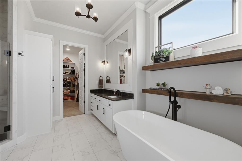 Beautiful custom-built, one-owner reverse 1.5 story offering quality craftsmanship and thoughtful upgrades throughout. This stunning home features soaring ceilings with exposed beams, creating a warm and inviting open floor plan. The spacious kitchen is equipped with high-end KitchenAid appliances, ample cabinetry, and flows seamlessly to an enclosed deck just off the kitchen—perfect for relaxing or entertaining. Enjoy the comfort of heated floors, custom blinds, tankless hot water, and dual-zoned HVAC for year-round efficiency. The main level offers generous living space while the finished walkout basement expands the home with additional living areas, bar, and plenty of room for guests or entertaining. This home includes 3 bedrooms and 4 bathrooms, providing space and privacy for everyone. You will appreciate the oversized 3-car garage featuring durable epoxy floors. Enjoy a lush, well maintained lawn made easy with a full ground sprinkler system. A rare opportunity to own a beautifully maintained custom home with premium upgrades and exceptional attention to detail.