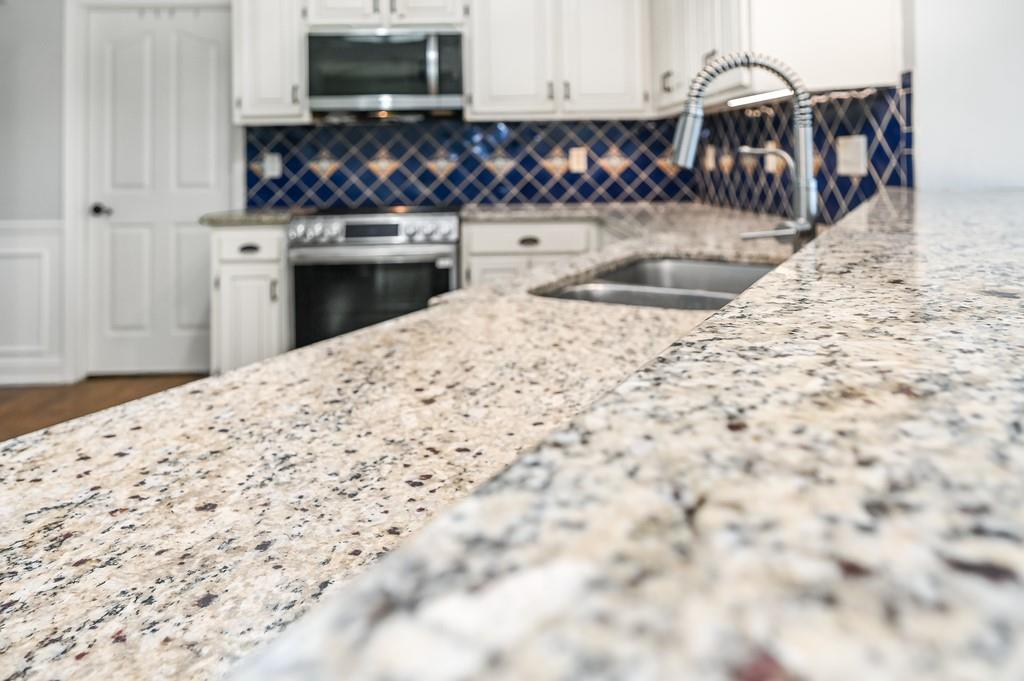 Kitchen with stainless steel appliances, dark wood-style floors, white cabinets, light stone counters, and tasteful backsplash