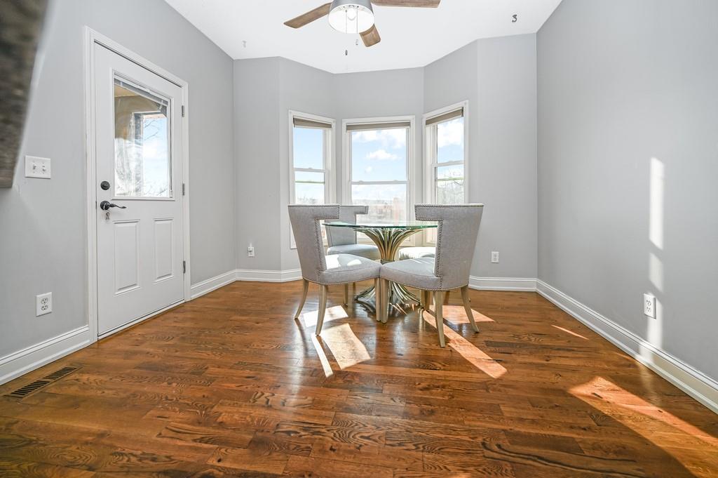 Dining space with ceiling fan, plenty of natural light, and dark wood-type flooring