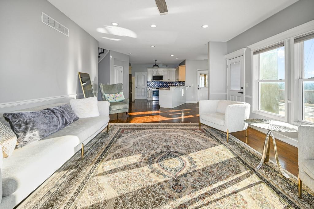 Living area featuring hardwood / wood-style floors, a ceiling fan, and recessed lighting