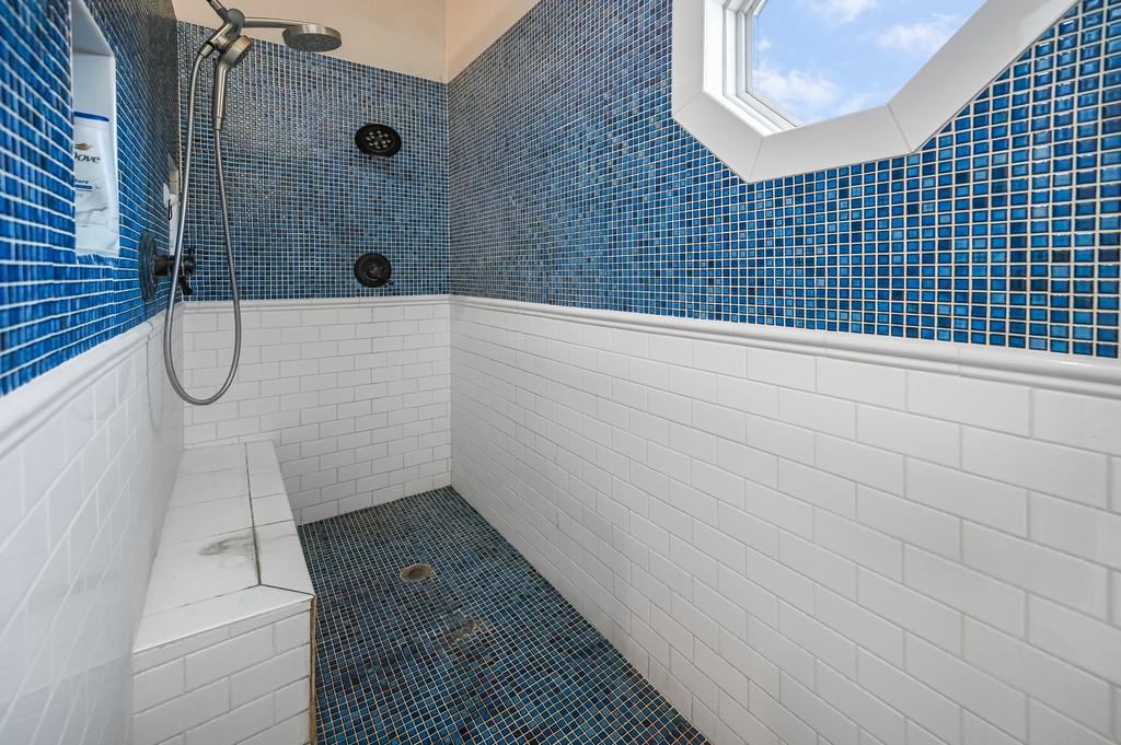 Ensuite bathroom with a jetted tub, light tile patterned floors, ceiling fan, and a shower stall