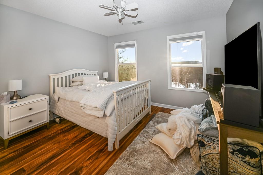 Bedroom with dark wood finished floors, a textured ceiling, and a ceiling fan