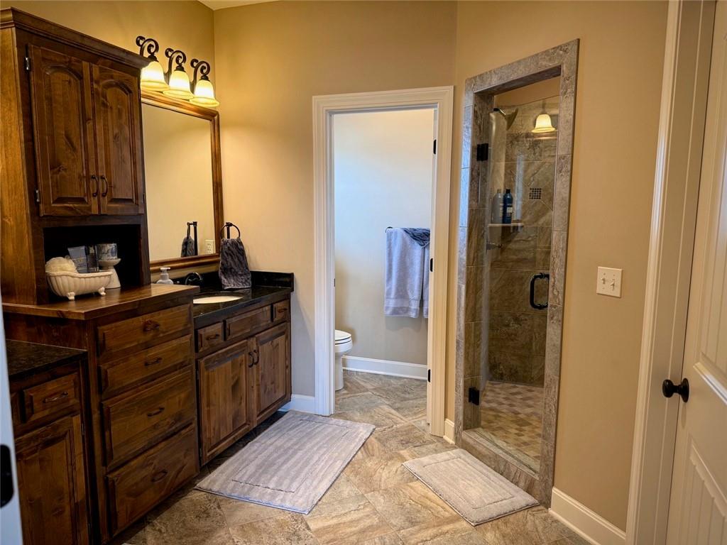 Spacious Reverse 1 1/2 story on large, fenced lot. Many custom features and nice landscaping. Main level open living area, laundry room, Primary suite plus 2 additional bedrooms and full bath, walkin pantry, covered deck. Lower level walkout to patio, with fenced yard, 1 bedroom, 1 bath plus storage area. Excellent location with easy access to downtown and highways. A couple of closets are California closet, large walkin pantry, sidewalk from garage to backyard, stone beds, water softner, newer front load washer/dryer, covered front porch, etc.