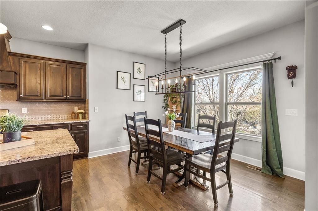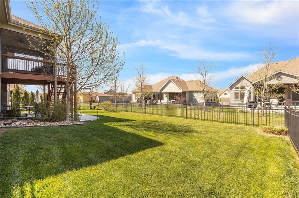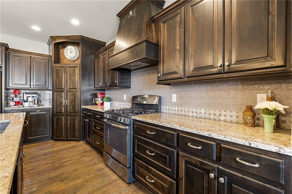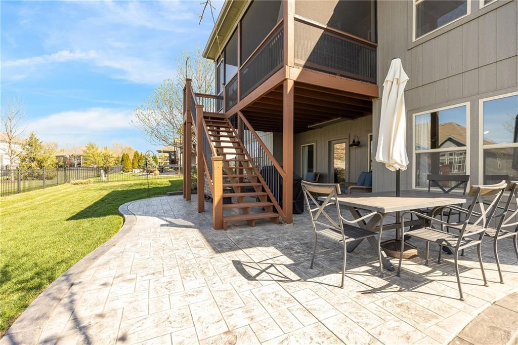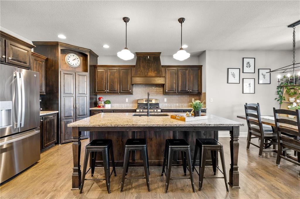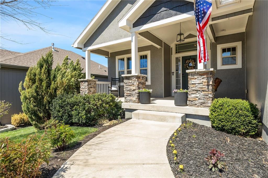 Stunning home in sought-after Chapel Hill, offering exceptional community amenities including two pools, clubhouse, playground, pickleball courts, and miles of scenic walking trails. A charming covered front porch welcomes you into a wood floor foyer, with hardwoods flowing throughout the main living areas, half bath, and mudroom. Thoughtfully designed, the mudroom features built-in bench seating, coat hooks, and cubbies, with convenient access to the garage and laundry room, which connects directly to the owner’s suite closet. The private main-level owner’s suite showcases a stepped ceiling, plush carpet, ceiling fan, and serene views of the wrought iron fenced backyard. The spa-like ensuite bath features tile flooring, a modern soaker tub, tiled shower, and direct access to the walk-in closet and laundry. The great room impresses with a wood-beamed ceiling, stone fireplace, and walls of windows, seamlessly opening to the kitchen and breakfast area. The kitchen is a true centerpiece with an oversized granite island with integral sink, walk-in pantry, stainless appliances, coffee nook, and butler’s pantry connecting to a front office or formal dining room with French doors. The breakfast area walks out to a covered deck, perfect for relaxing or entertaining. Upstairs offers four bedrooms, all with ceiling fans, including a private suite and a Hollywood bath shared between two bedrooms; all baths feature tile floors and granite counters. The finished walk-out lower level expands your living space with a family room, recreation area with wet bar, built-ins, microwave nook, and space for a full-size refrigerator. A fifth bedroom, full bath, and abundant storage complete the lower level. Enjoy outdoor living on the stamped and stained concrete patio within the fenced backyard. Ideally located near Heritage Park with golf, fishing, and an off-leash dog park just moments away.