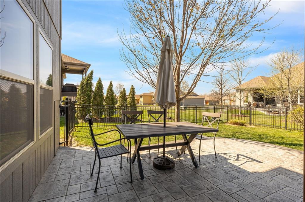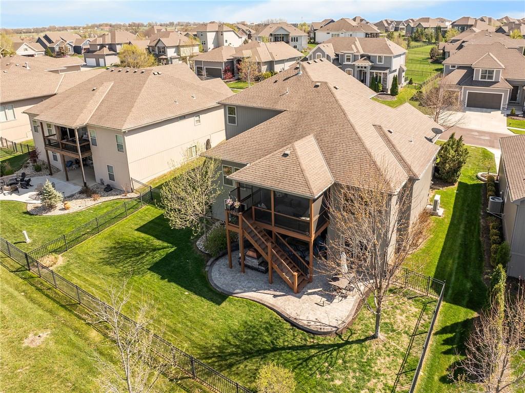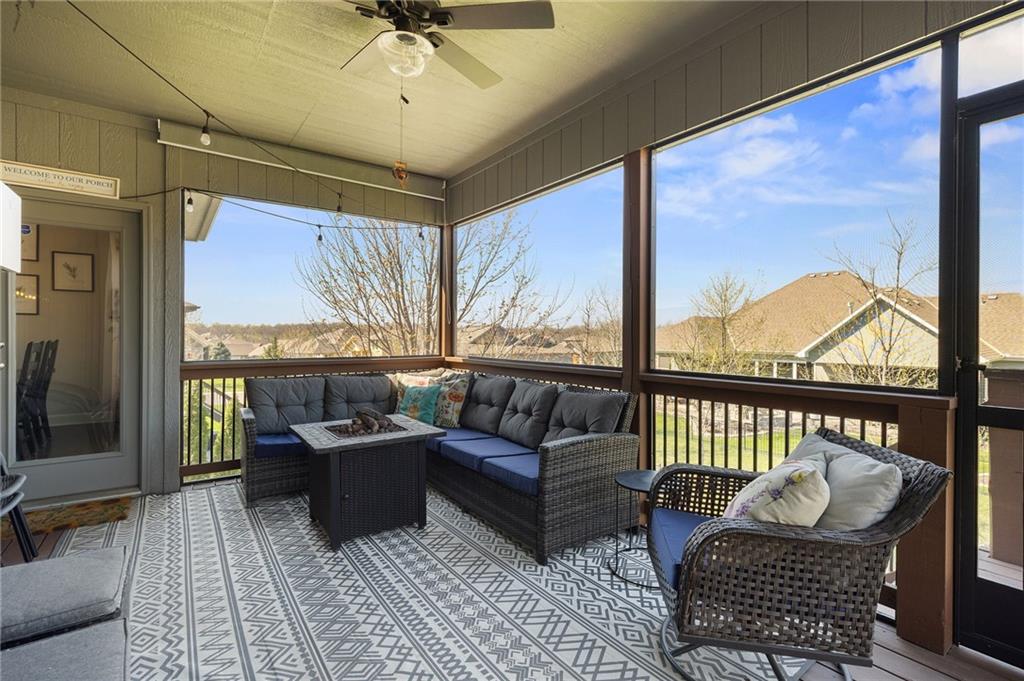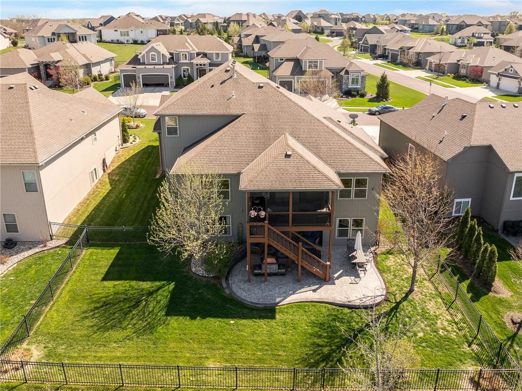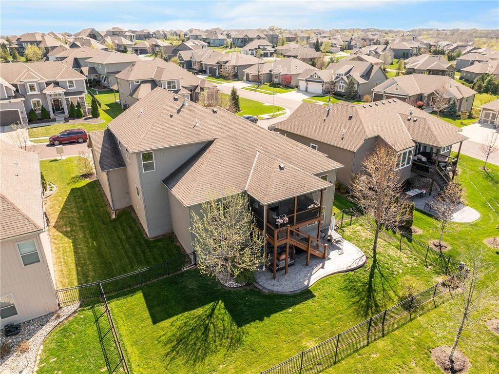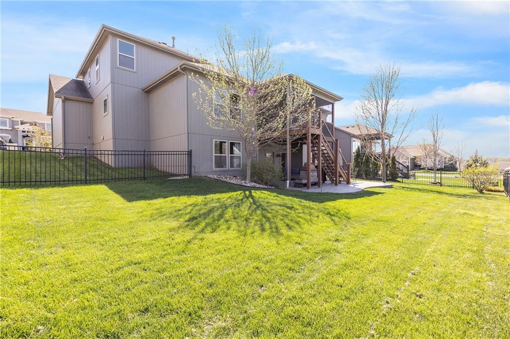 Stunning home in sought-after Chapel Hill, offering exceptional community amenities including two pools, clubhouse, playground, pickleball courts, and miles of scenic walking trails. A charming covered front porch welcomes you into a wood floor foyer, with hardwoods flowing throughout the main living areas, half bath, and mudroom. Thoughtfully designed, the mudroom features built-in bench seating, coat hooks, and cubbies, with convenient access to the garage and laundry room, which connects directly to the owner’s suite closet. The private main-level owner’s suite showcases a stepped ceiling, plush carpet, ceiling fan, and serene views of the wrought iron fenced backyard. The spa-like ensuite bath features tile flooring, a modern soaker tub, tiled shower, and direct access to the walk-in closet and laundry. The great room impresses with a wood-beamed ceiling, stone fireplace, and walls of windows, seamlessly opening to the kitchen and breakfast area. The kitchen is a true centerpiece with an oversized granite island with integral sink, walk-in pantry, stainless appliances, coffee nook, and butler’s pantry connecting to a front office or formal dining room with French doors. The breakfast area walks out to a covered deck, perfect for relaxing or entertaining. Upstairs offers four bedrooms, all with ceiling fans, including a private suite and a Hollywood bath shared between two bedrooms; all baths feature tile floors and granite counters. The finished walk-out lower level expands your living space with a family room, recreation area with wet bar, built-ins, microwave nook, and space for a full-size refrigerator. A fifth bedroom, full bath, and abundant storage complete the lower level. Enjoy outdoor living on the stamped and stained concrete patio within the fenced backyard. Ideally located near Heritage Park with golf, fishing, and an off-leash dog park just moments away.