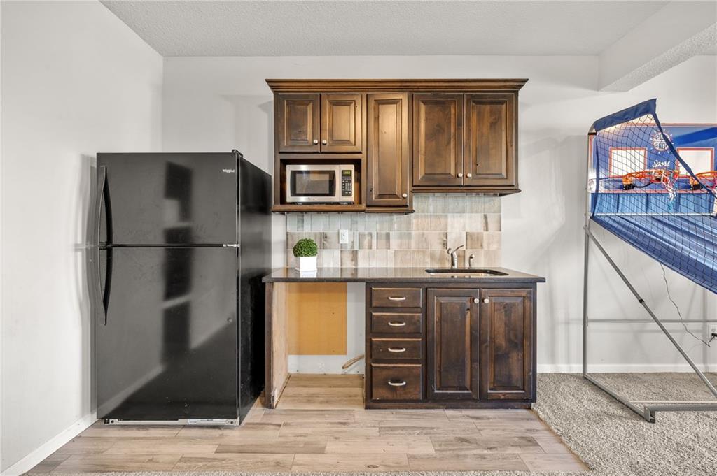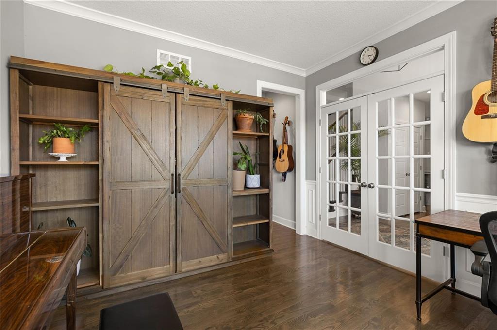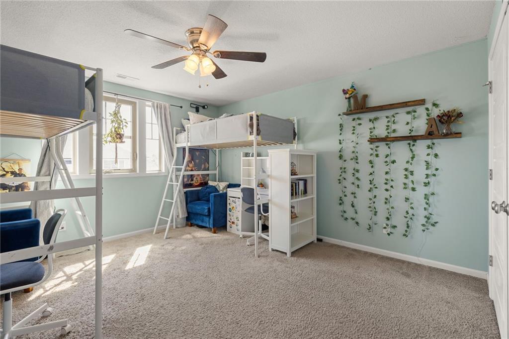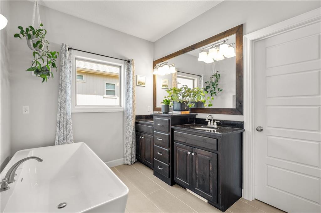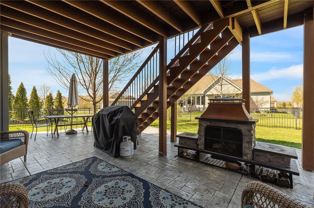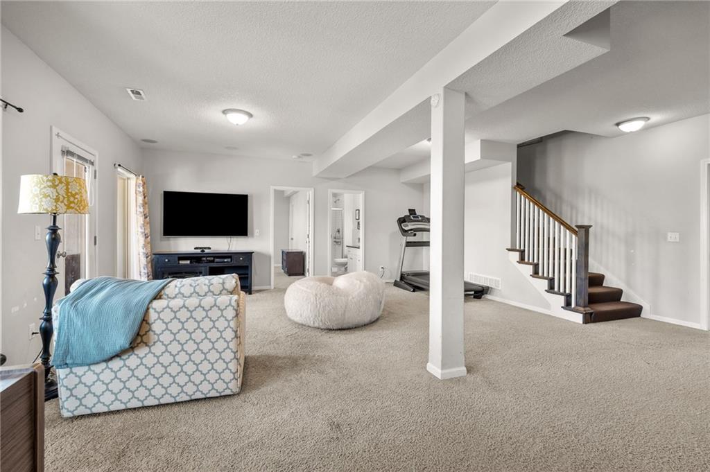 Stunning home in sought-after Chapel Hill, offering exceptional community amenities including two pools, clubhouse, playground, pickleball courts, and miles of scenic walking trails. A charming covered front porch welcomes you into a wood floor foyer, with hardwoods flowing throughout the main living areas, half bath, and mudroom. Thoughtfully designed, the mudroom features built-in bench seating, coat hooks, and cubbies, with convenient access to the garage and laundry room, which connects directly to the owner’s suite closet. The private main-level owner’s suite showcases a stepped ceiling, plush carpet, ceiling fan, and serene views of the wrought iron fenced backyard. The spa-like ensuite bath features tile flooring, a modern soaker tub, tiled shower, and direct access to the walk-in closet and laundry. The great room impresses with a wood-beamed ceiling, stone fireplace, and walls of windows, seamlessly opening to the kitchen and breakfast area. The kitchen is a true centerpiece with an oversized granite island with integral sink, walk-in pantry, stainless appliances, coffee nook, and butler’s pantry connecting to a front office or formal dining room with French doors. The breakfast area walks out to a covered deck, perfect for relaxing or entertaining. Upstairs offers four bedrooms, all with ceiling fans, including a private suite and a Hollywood bath shared between two bedrooms; all baths feature tile floors and granite counters. The finished walk-out lower level expands your living space with a family room, recreation area with wet bar, built-ins, microwave nook, and space for a full-size refrigerator. A fifth bedroom, full bath, and abundant storage complete the lower level. Enjoy outdoor living on the stamped and stained concrete patio within the fenced backyard. Ideally located near Heritage Park with golf, fishing, and an off-leash dog park just moments away.