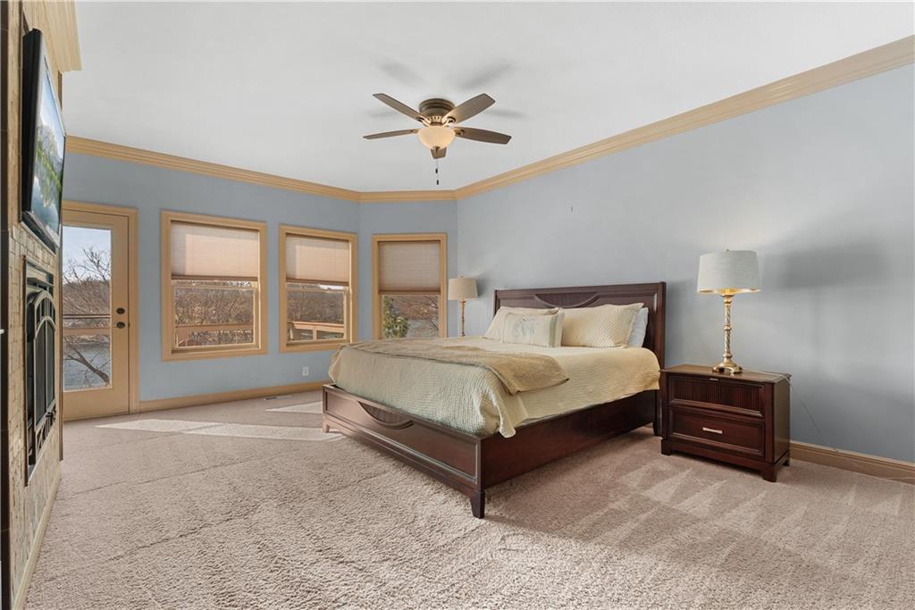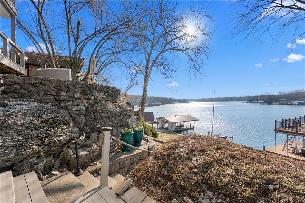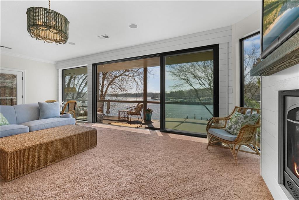 Experience exceptional lakefront living in this stunning main-channel home offering deep water and breathtaking views. Perfectly positioned with a double-well dock and boat lift and sun deck, this property is designed for both relaxation and recreation. The beautifully landscaped grounds lead to a thoughtfully designed home featuring a spacious 4-car garage and high-end finishes throughout. Inside, the gourmet kitchen boasts a walk-in pantry and flows seamlessly into a formal dining room and an impressive great room with a fireplace. The true showstopper is the wall of "moving glass wall", creating a completely unobstructed opening that blends indoor and outdoor living while showcasing the lake beyond. Step outside to a lakeside Trex deck spanning the length of the home, complete with a sunken hot tub, or unwind in the enclosed screened-in patio. The luxurious primary suite offers its own fireplace, private balcony with panoramic lake views, and a spa-like bath with separate vanities and a spacious closet. Two additional lakeside bedrooms provide incredible views and access to a screened-in deck, while a generously sized fourth bedroom above the garage offers added privacy. Designed for entertaining, the expansive family room that is ideal as a man cave or bunk room—features another fireplace, making it the perfect gathering space for family and guests. This is lake living at its finest.