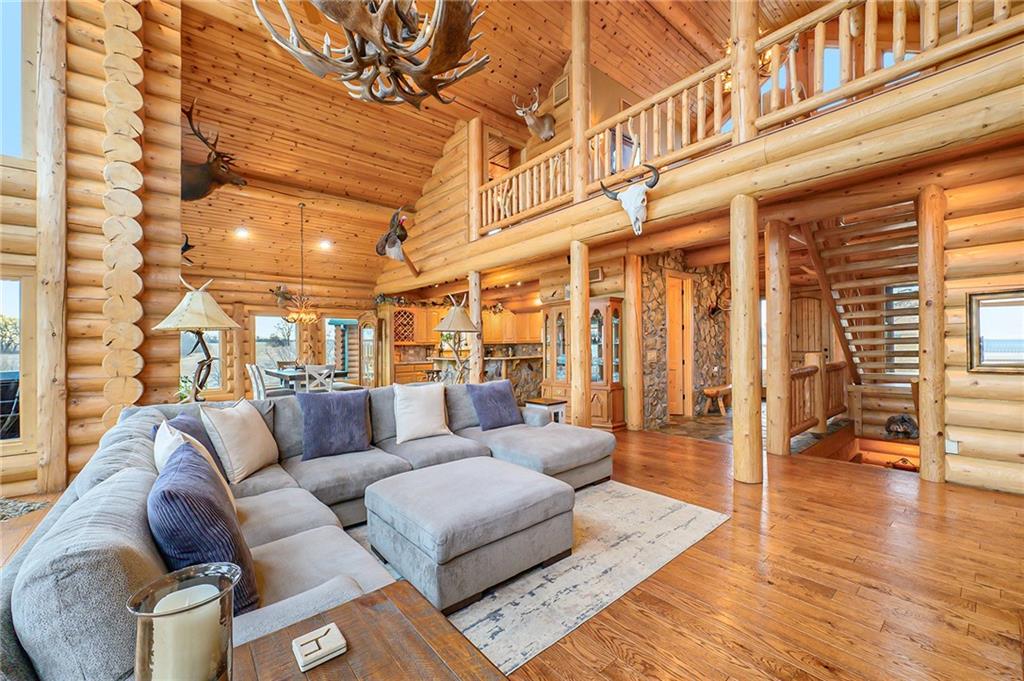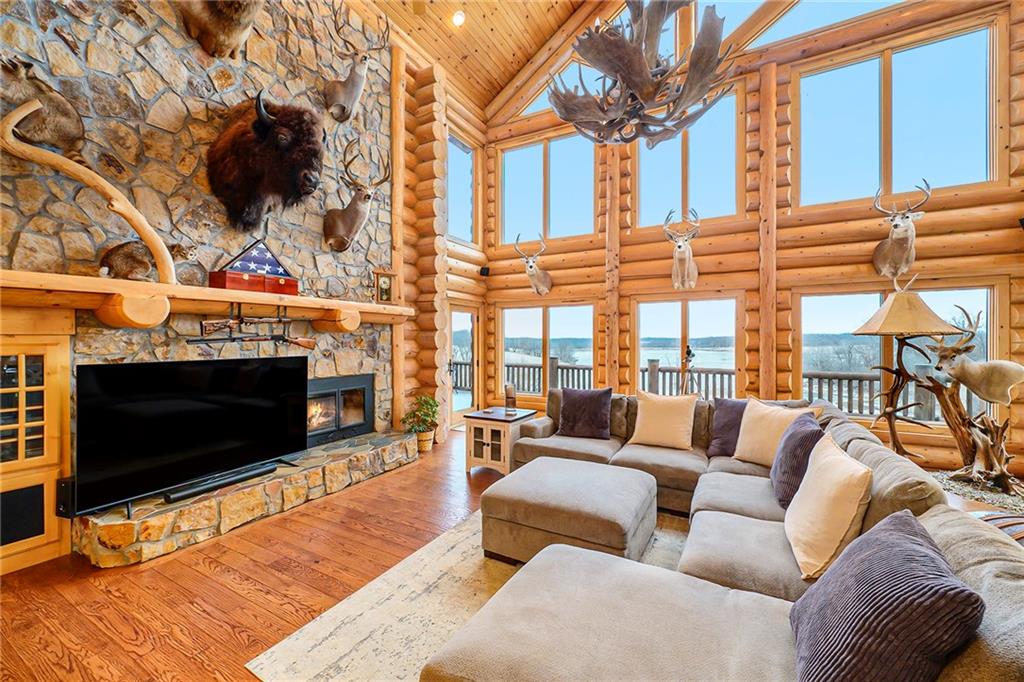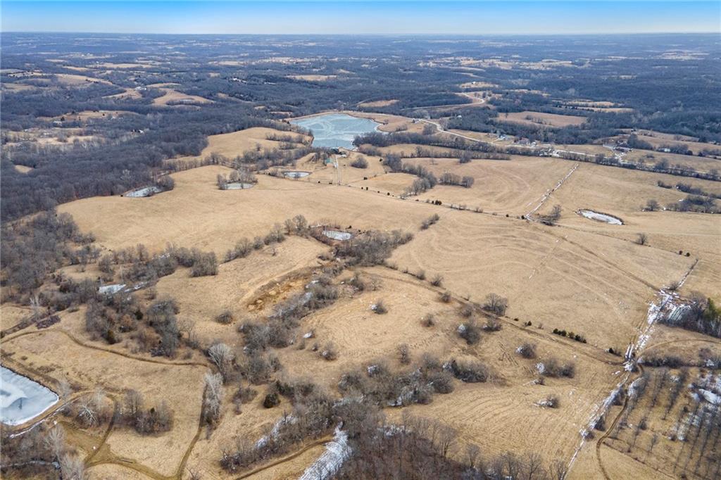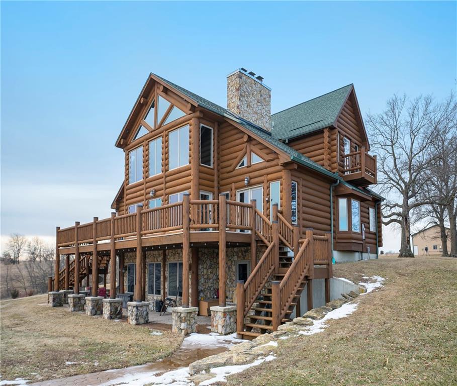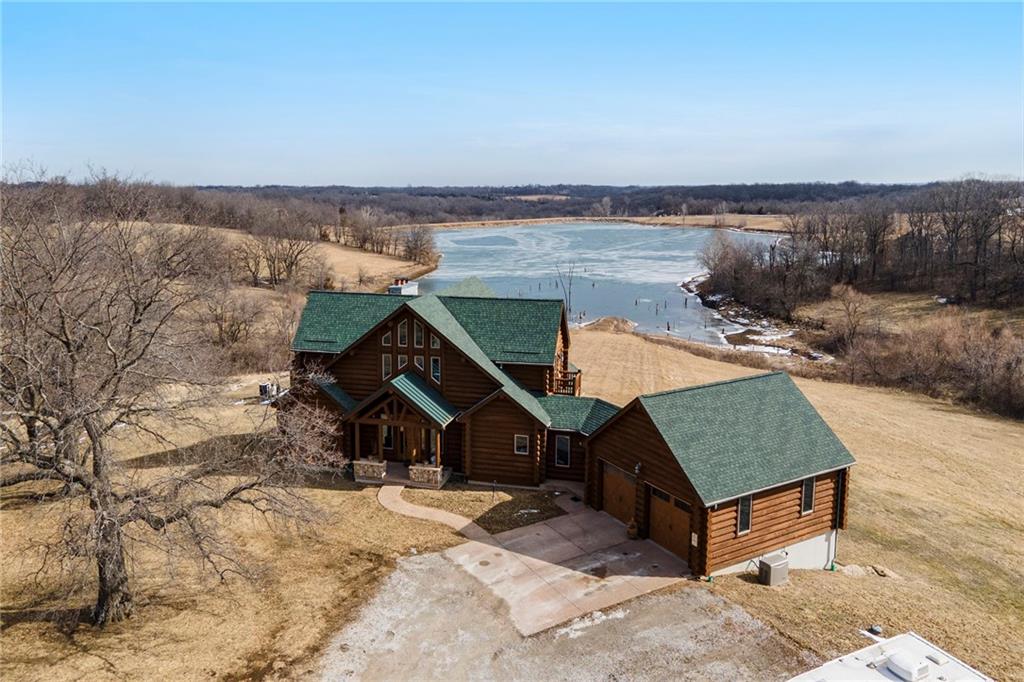 STUNNING CUSTOM LOG HOME located on 67+/- acres FULLY FENCED & cross fenced featuring a GORGEOUS LAKE!! 40x98 OUTBUILDING & lean to w/solar panels. PASTURE GROUND for your LIVESTOCK & HAY PRODUCTION along with timber. This RURAL RETREAT offers loads of RECREATIONAL OPPORTUNITIES for you and your family! The 4 bedroom 4.5 bath home offers an OPEN PLAN perfect for entertaining! CHEF'S KITCHEN features HUGE ISLAND, granite tops, CUSTOM CABINETS w/roll outs, pantry, dining space & more! SOARING CEILINGS & so many windows to take in the VIEWS! Main level primary suite w/SITTING ROOM & BEAUTIFUL STONE FIREPLACE! Don't miss the spacious laundry and mud room space for convenience. The upper level has 2 SECONDARY BEDROOMS with their own PRIVATE BATHS, walk in closets and balconies. The LOFT SPACE overlooks the EXQUISITE GREAT ROOM, STONE FIREPLACE and WALL OF WINDOWS! Finished walk out LL has the 4th bedroom & full bath, 16x8 SAFE ROOM, bonus room, REC ROOM W/3RD stone fireplace and WET BAR and 2 storage spaces. RELAX and watch the SUNSETS & WILDLIFE from the low maintenance deck overlooking the SALT WATER IN GROUND POOL & LAKE! This is a ONE OF A KIND meticulously maintained property 30 minutes from Kansas City. Square footage, acreage, schools, taxes, etc are approximate...buyer and buyer's agent to verify