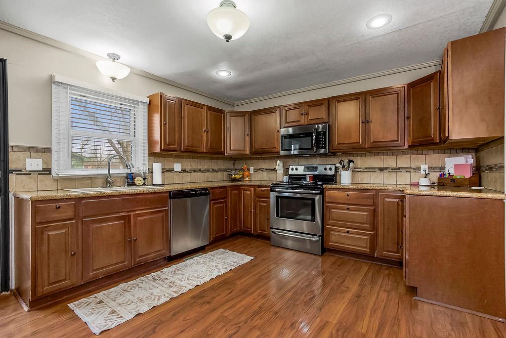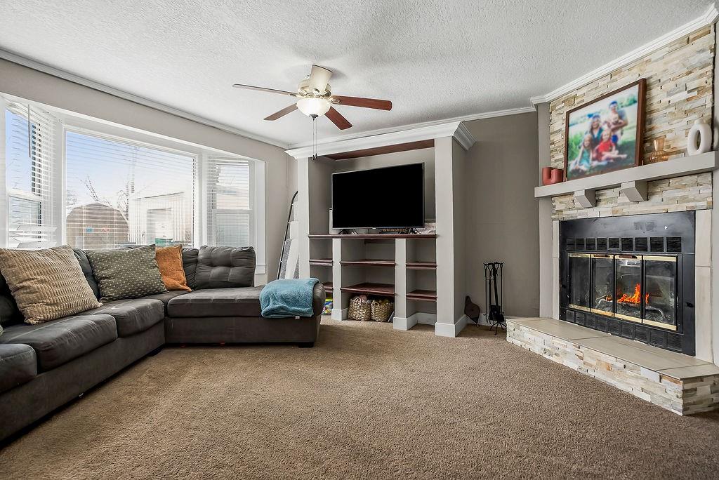 Spacious, easy one-level living at its best! The cozy family room welcomes you with a charming bay window, custom blinds, built-in shelving, and a warm fireplace—perfect for relaxing evenings at home. Entertain with ease in the large formal dining room, featuring classic wainscoting, durable wood-look flooring, and a ceiling fan for added comfort. The open kitchen is a standout with granite countertops, abundant cabinetry, stainless steel appliances, and a pantry for extra storage. The private primary suite is thoughtfully positioned on one side of the home, offering a peaceful retreat with its own ensuite bath and an oversized walk-in closet with stylish barn door. All bedrooms include walk-in closets, ceiling fans, and blinds—plenty of space and comfort for everyone. The third bedroom even offers a bright bonus sitting room or play space filled with natural light. A second full bath features tile flooring and a convenient shower/tub combo. You’ll also love the functional laundry room just off the kitchen, complete with additional pantry space and access to the cellar. Step outside to a HUGE fenced backyard that feels like it goes on forever—ideal for pets, play, or entertaining—plus a spacious deck ready for grilling season. Car enthusiasts, hobbyists, or small business owners will appreciate the attached 1-car garage AND the impressive 768 sq ft workshop next door, complete with a 2-car garage door, electricity, and a 10x10 covered entry. Bonus: Brand new roof! All of this sits on a desirable corner lot—giving you space, flexibility, and room to grow.