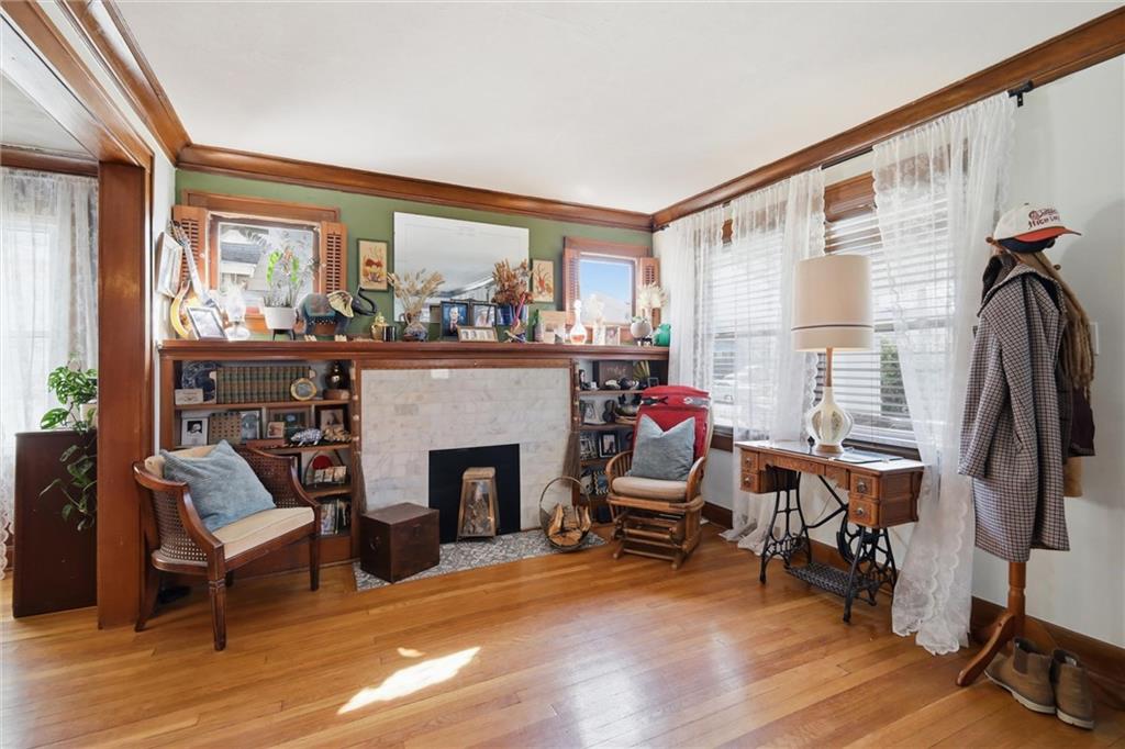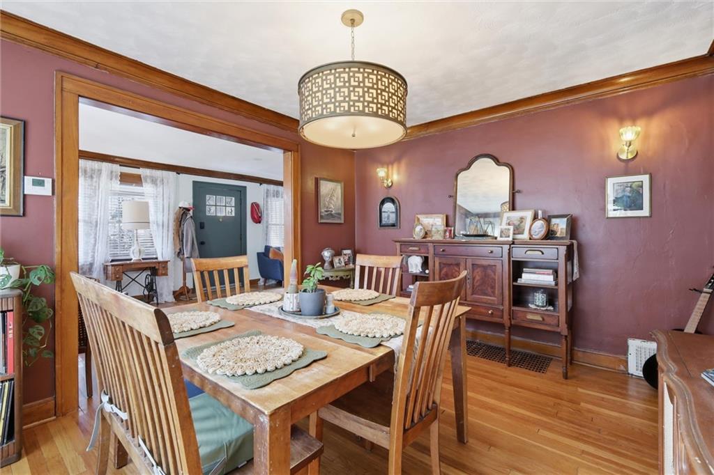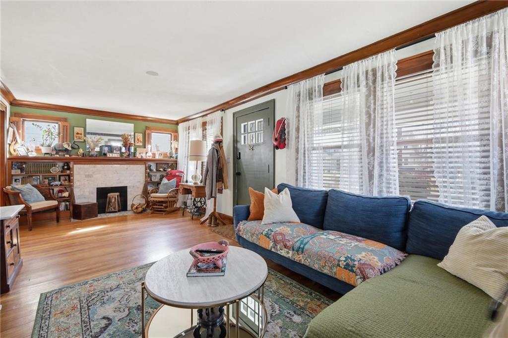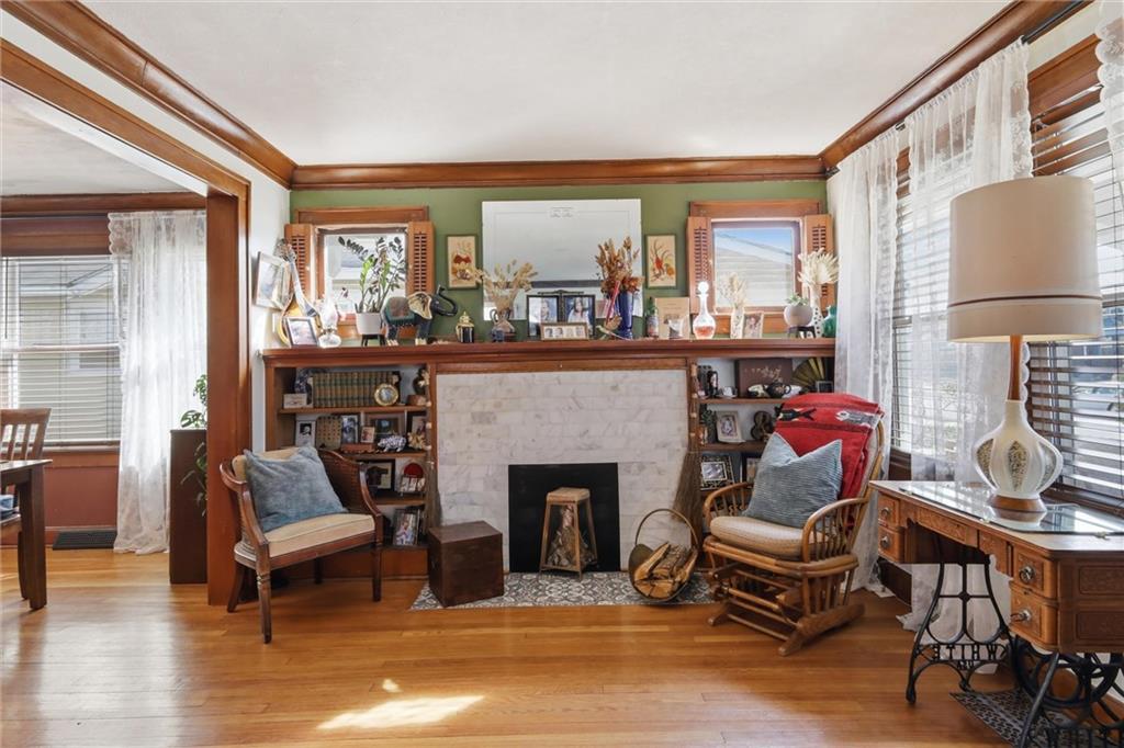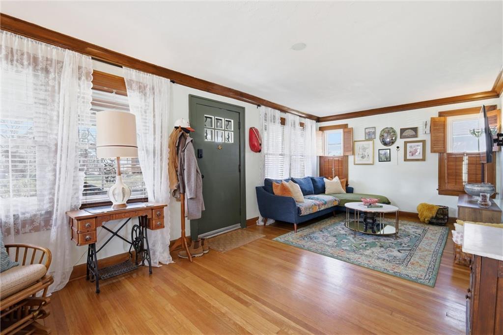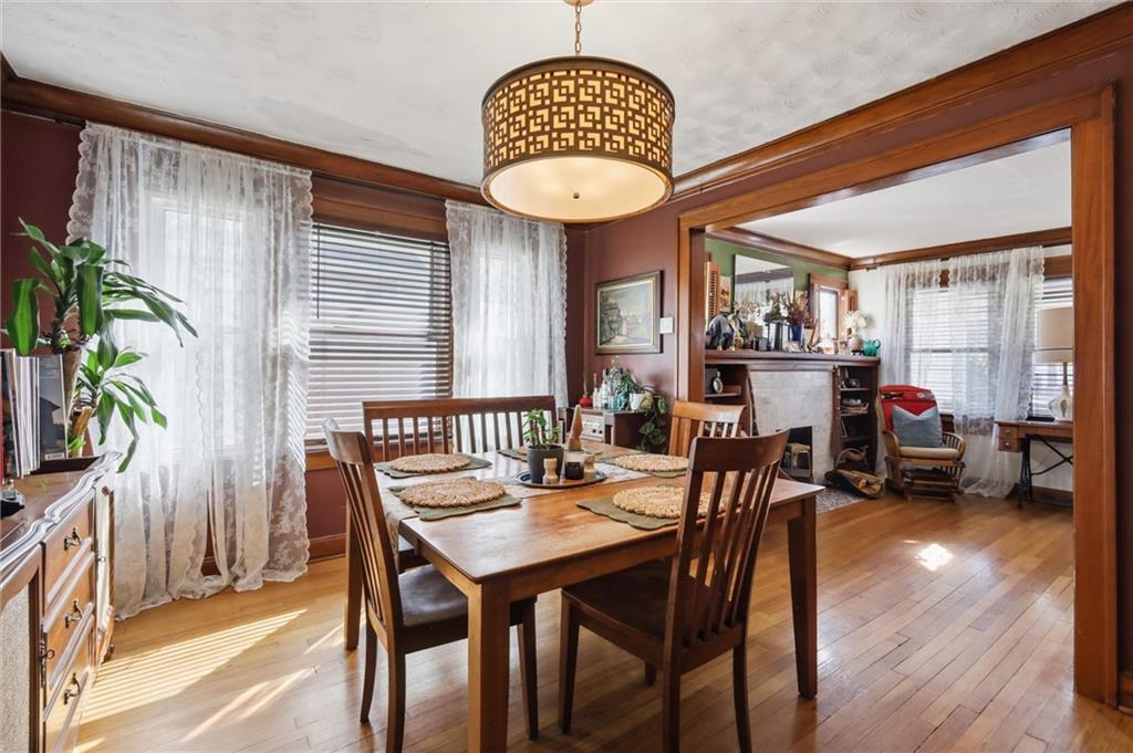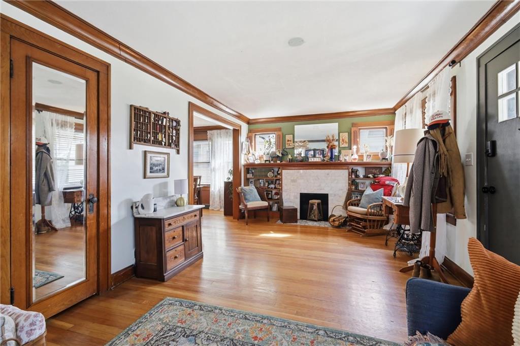 This charming 3-bedroom, 1.5-bath home is full of warmth, character, and the kind of original detail that is getting harder and harder to find. From the moment you step inside, you’re welcomed by beautiful original hardwood floors, rich unpainted trim and moldings in the front of the home, and a sense of craftsmanship that simply cannot be replicated. The dining and front living spaces showcase stunning original woodwork, original doors, and gorgeous wood blinds that perfectly complement the home’s timeless personality. The marble fireplace creates a beautiful focal point, while the original windows above the mantle add even more historic charm. In the bedrooms, original trim has been thoughtfully preserved and painted, blending character with a fresh, livable feel. Privacy and blackout blinds in all bedrooms offer comfort and function. The kitchen is a true nod to the home’s history, featuring custom-built cabinetry from the 1960s, an original swinging kitchen door, and a layout that feels both nostalgic and practical. The remodeled bathroom was carefully designed to honor the home’s era, giving it a period-appropriate feel with updated livability. Downstairs, new ceiling fans add comfort, and the full basement offers valuable extra space for storage, hobbies, or future possibilities. Upstairs, the home continues to impress with a functional landing area complete with shelving, creating a useful flex space for books, storage, a reading nook, or a small work area. The upstairs bedroom is extra large and offers incredible versatility, with plenty of room to create a spacious primary retreat, sitting area, office nook, or other customized use to fit your lifestyle. This is a home with soul — lovingly maintained, full of story, and ready for its next chapter.