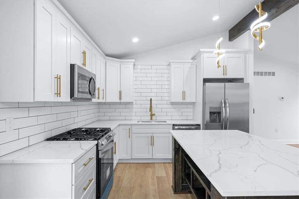 Beautifully fully updated 3 bed, 2 bath ranch in Overland Park! This move in ready home has been thoughtfully renovated from top to bottom with nearly everything brand new including HVAC, roof, gutters, water heater, and new fixtures throughout, giving the home a fresh modern feel at every turn. Fresh interior paint and updated landscaping create standout curb appeal, while the inside welcomes you with a bright open concept layout perfect for everyday living and entertaining. The kitchen is a true showpiece featuring a large quartz island, subway tile backsplash, gas range stove, ample cabinetry, and generous prep space. Just off the kitchen, enjoy seamless indoor outdoor living with a brand new covered patio that is perfect for relaxing evenings or hosting guests year round. Both bathrooms have been fully updated with beautifully tiled showers and modern finishes. The spacious primary suite offers a spa like retreat complete with a soaking tub, dual vanities, a glass enclosed shower, and a large walk in closet. With high end updates, stylish finishes, and a functional layout throughout, this home is truly turn key and ready for its next owner.
