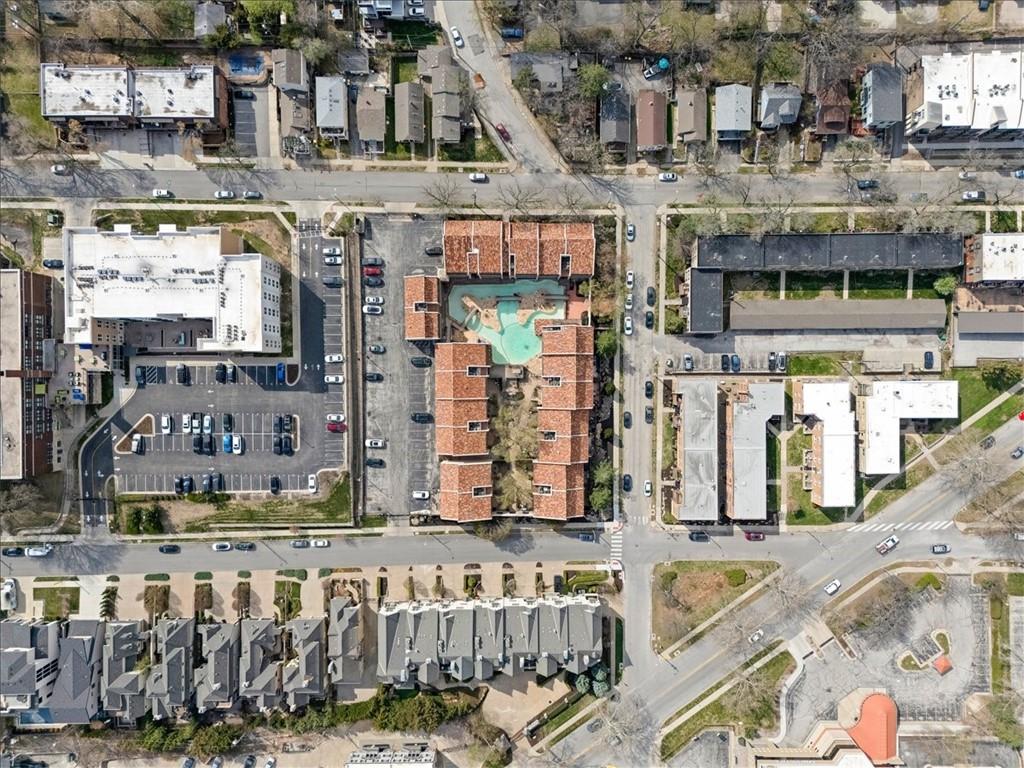 Bella Condominiums offers a lifestyle-focused living experience just moments from the Country Club Plaza. This charming Spanish-style community is centered around a resort-style pool, creating a relaxed, low-maintenance setting in a highly desirable location. This second-floor unit features true single-level living with a blend of character and thoughtful updates throughout. Interior highlights include exposed beams, wood floors, and an electric fireplace that anchors the main living space. The updated kitchen is equipped with modern finishes, ample cabinetry, and all appliances remain, including the in-unit washer/dryer combo. A standout feature of the home is the double French door entry leading to a covered deck with views overlooking the community pool—offering a seamless extension of the living space and a great spot to unwind. The unit includes two bedrooms with flexible use, along with an updated bathroom featuring quality finishes. One gated off-street parking space is included. Residents of Bella enjoy secured access and amenities such as a clubhouse, fitness center, poolside entertaining areas, and maintained grounds—ideal for a lock-and-leave lifestyle. Move-in ready and perfectly positioned near premier shopping, dining, and entertainment, this is an excellent opportunity to enjoy comfortable, convenient living near the Plaza.