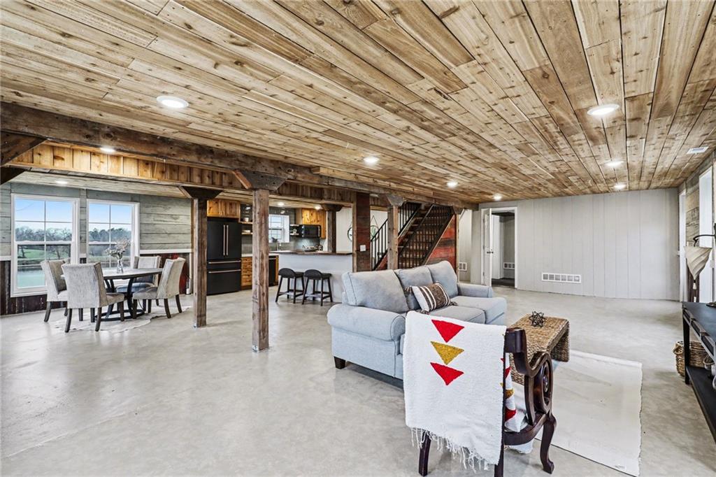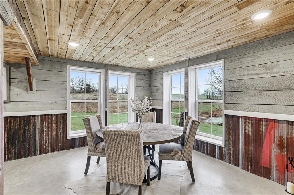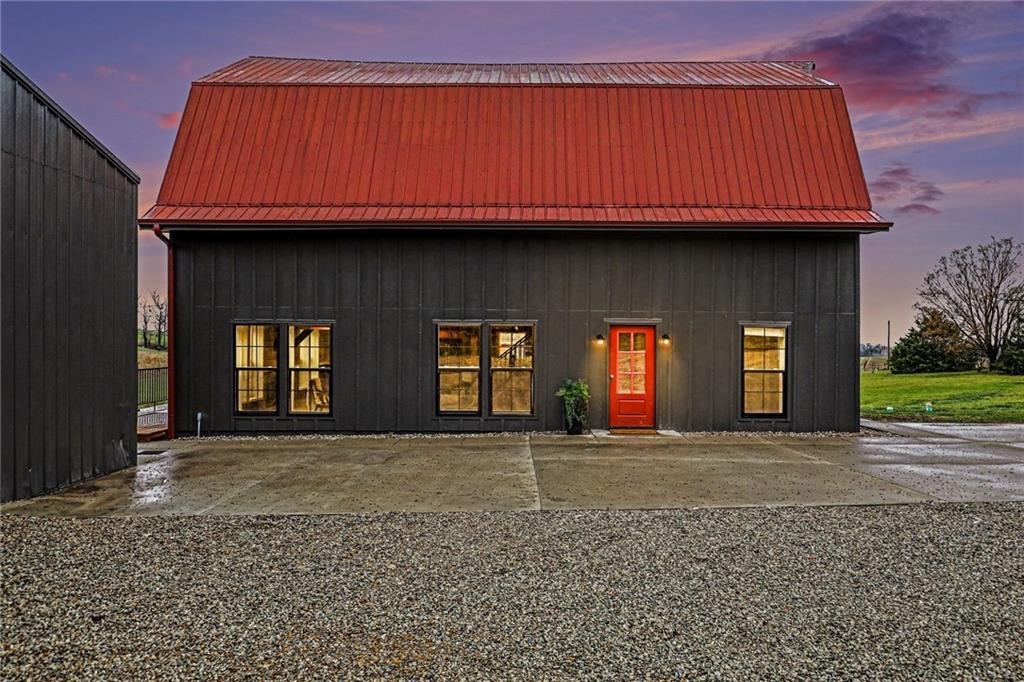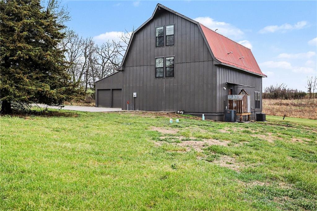 Experience the perfect marriage of turn-of-the-century character and cutting-edge luxury in this stunning 1900 barn conversion! Situated on 4.75 private acres, a half-hour from KC International airport, this three-story masterpiece has been meticulously reimagined into a sophisticated four-bedroom, five-bathroom retreat that defines "one of a kind." The main level anchors the home with a chef’s dream kitchen. Designed for both high-function and high-style with premium GE Café appliances and professional-grade finishes. With warm pine accents that nod to the structure's historic roots, an expansive layout flows effortlessly into the first of two distinct living areas. Ascend to the second floor to find a spectacular lofted great room. This massive secondary living space is the ultimate "game-day" destination, complete with a dedicated wet bar and a layout designed for large-scale entertaining or quiet relaxation. The primary suite is a masterclass in convenience and comfort, offering dual walk-in closets and integrated secondary washer/dryer hookups, ensuring laundry day is effortless. Spa-like finishes that create a true sanctuary. The beauty of the 4.75-acre lot is pulled indoors through thoughtful design, but the outdoor features are equally impressive. After a day exploring the grounds, use the outdoor shower to rinse off while overlooking the serene pond—perfect for keeping both owners and pets clean. A 42x30 outbuilding provides ample space for a workshop, studio, or equipment storage. This isn't just a home; it's a piece of history updated for the modern connoisseur with Smithville Lake, shopping and dining less than 20 minutes down the road. Schedule your private tour today to experience the scale and craftsmanship of this rural luxury estate!
