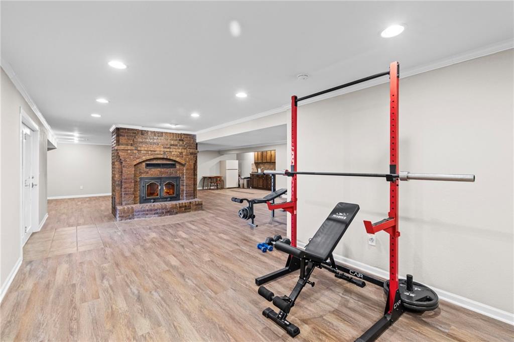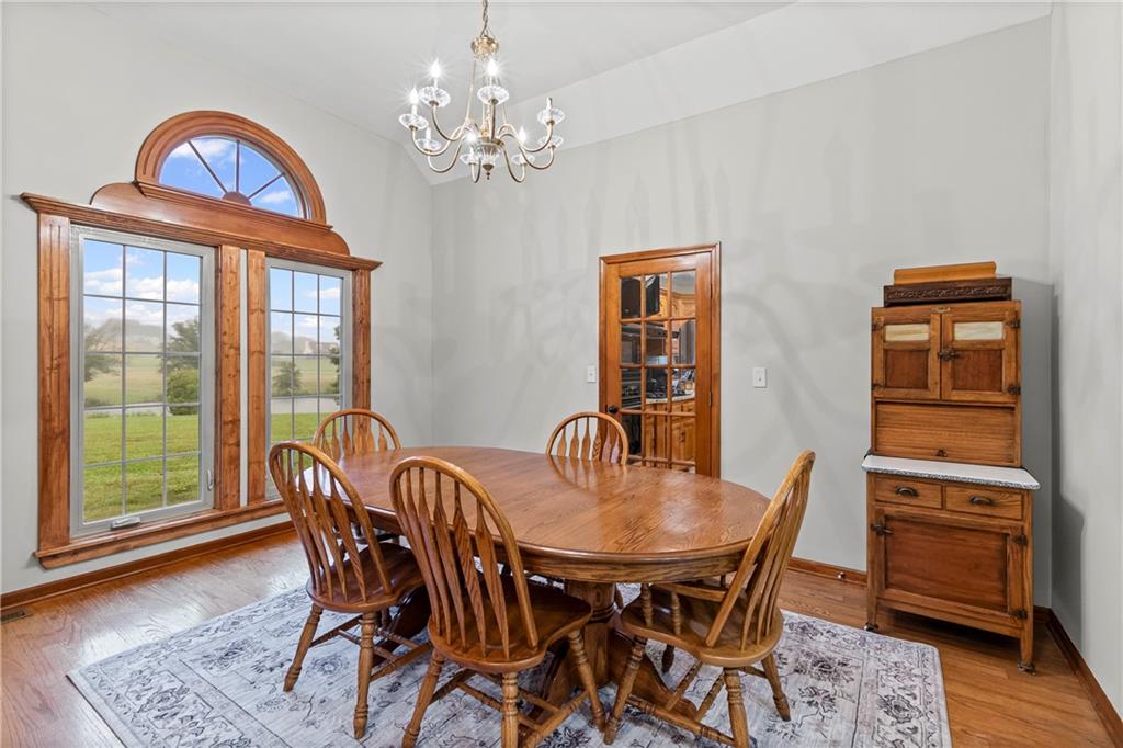 Enjoy peace, quiet, and a fantastic location—just 30 minutes to Liberty and 15 minutes to Excelsior Springs. Settled on 7.63 private acres, this brick ranch is rare. Step inside the grand, 14-foot entryway, where you'll find high-quality, durable tile work that continues into the kitchen. The home's custom woodwork is immediately apparent, setting a tone of enduring quality. The spacious kitchen is a foodie's delight, appointed with NEW GRANITE COUNTERTOPS, a pull-out-drawer pantry, a heavy-duty gas cooktop, and a charming breakfast nook with picturesque views. The main living area is anchored by one of two oversized cast-iron wood-burning hearths. Paired with NEW WINDOWS throughout and NEW CARPETING, NEW GARAGE DOORS and OPENERS, this home offers remarkable energy efficiency. Imagine cozy winters where these powerful hearths can heat the entire home, keeping comfort high not utility costs. The master suite is an escape. The private en suite features an elegant, walk-in shower and a luxurious dual waterfall Jacuzzi tub. NEW "his and her" vanities and oversized closets complete this personal touch. The versatile finished walk-out basement, including NEW LVP FLOORING, offers nearly 2,000 sq ft of incredible potential. It includes a beautifully finished bathroom, bedroom, kitchenette, extra room for home office or play space, and a concrete-enclosed "safe room." Step outside to enjoy peaceful country living from the massive rear deck. You can rest easy knowing that major system updates are complete, ensuring years of worry-free living. The home is equipped with NEWER HVAC, and two water heaters. This is more than a home. It offers exceptional quality and endless possibilities. Thank you for looking!