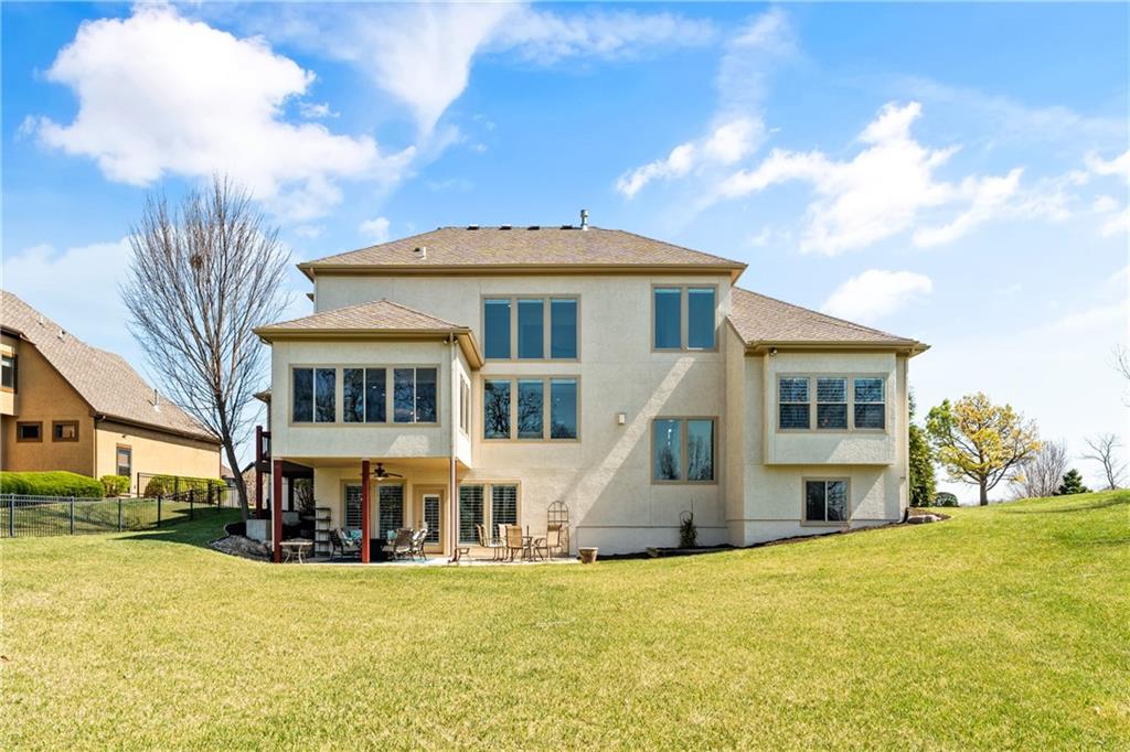 Located in the desirable River Ridge Farms West subdivision, this exceptional home is framed by beautifully landscaped grounds and a welcoming front façade that radiates elegance. Set on an estate lot (over half an acre) with open rear views, the home offers privacy and tranquil sunset vistas. A formal dining room off the entry flows seamlessly into the open two-story great room, filled with natural light and anchored by a striking corner fireplace, creating a warm and inviting atmosphere. The chef’s kitchen features granite countertops, a marble backsplash, Thermador double wall ovens, ample cabinet and counter space, and a walk-in pantry. An adjacent dining area opens to a grill deck, perfect for effortless outdoor entertaining, and leads directly into a sunroom with a floor-to-ceiling stone fireplace and built-in shelving—a cozy retreat for morning coffee or relaxing any time of day. The primary suite is a serene haven with tray ceilings and abundant natural light. Its ensuite bath includes double vanities, a soaking tub, and a separate walk-in shower with dual shower heads. Spacious secondary bedrooms each feature their own private bathrooms, and two laundry rooms make daily living convenient. The expansive finished walkout lower level offers versatile living space with a rec room, wet bar, an additional bedroom, and full bathroom. Step outside to a patio overlooking the large backyard, ideal for relaxing or entertaining. A circular driveway provides easy access, and the 4-car garage with extended storage accommodates vehicles, bikes, and more. Located in the highly sought-after Blue Valley School District, this home offers easy highway access and is conveniently close to shopping, dining, and less than 5 minutes to Aubrey Vineyards. Your lifestyle of tranquility and comfort awaits.