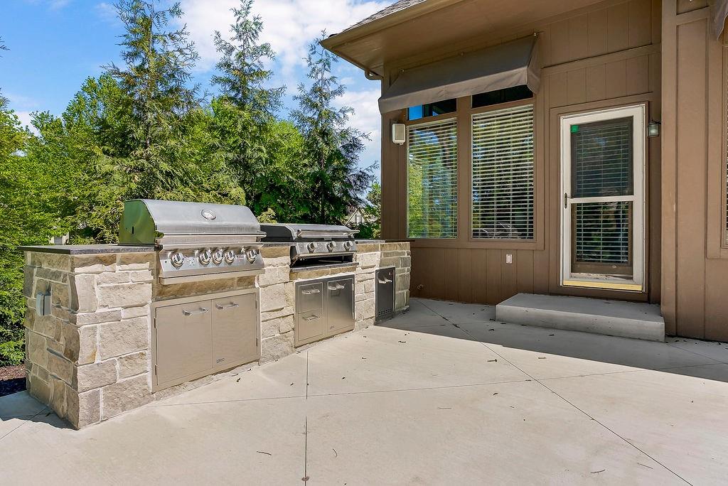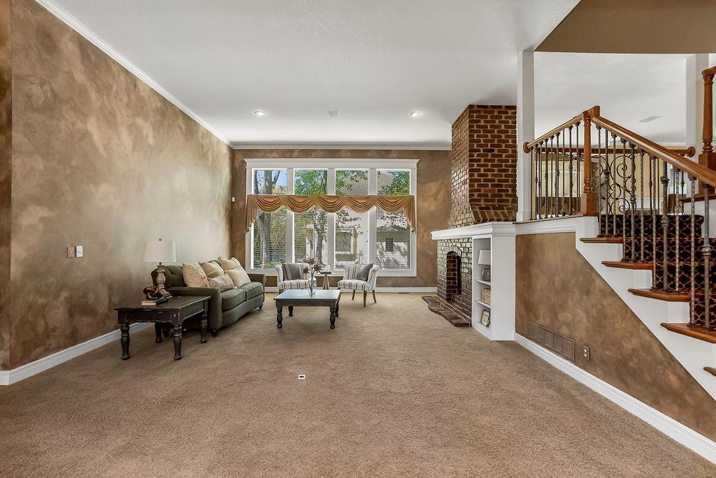 Beautifully maintained home showcasing a unique and functional layout, highlighted by a striking double-sided brick fireplace that seamlessly connects the kitchen, sitting area, and family room—creating a warm and inviting atmosphere throughout the main living spaces. A grand staircase serves as an architectural focal point, offering access from both the entryway and kitchen and enhancing the home’s character and flow. The spacious kitchen features abundant cabinet storage and generous workspace, ideal for both everyday living and entertaining. The main-floor primary suite provides comfort and convenience, complete with a large closet. Expansive windows throughout the main level fill the home with natural light, adding to its bright and welcoming feel. The finished basement offers exceptional additional living space, including a kitchenette, making it perfect for hosting guests, extended living arrangements, or recreation. Step outside to enjoy the newer patio, complete with a built-in grill and countertop, surrounded by fresh landscaping—an ideal setting for outdoor entertaining or relaxing evenings at home. An oversized 3-car garage provides ample room for vehicles, storage, and hobbies. This home combines thoughtful design, generous space, and inviting indoor and outdoor living—ready to welcome its next owner.