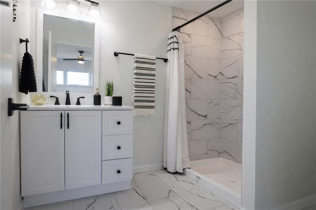 Full bath featuring a marble finish shower, vanity, light marble finish floors, and ceiling fan