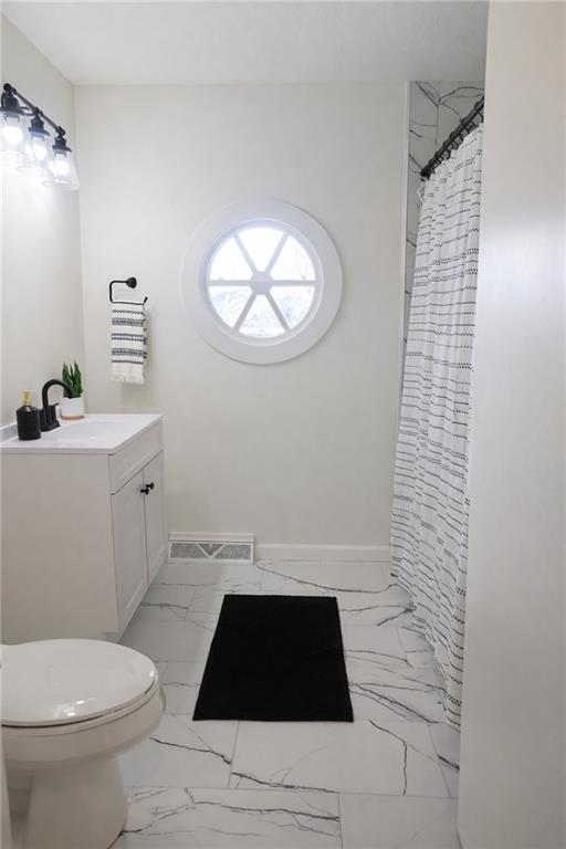 Bathroom featuring vanity, a shower with curtain, and light marble finish flooring