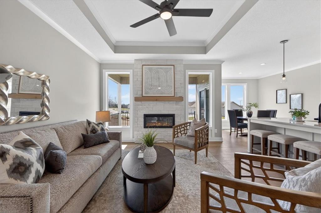 NEW MODEL HOME - NOT FOR SALE. Welcome to the Lakewood by Lambie Homes, a beautifully designed reverse 1.5-story floor plan located in the maintenance-provided Mize Hill community in Lenexa. This model showcases mid-level interior finishes and thoughtful design throughout, offering 4 bedrooms, 3 bathrooms, and a functional layout ideal for everyday living and entertaining.The main level features an open-concept design with a spacious great room, highlighted by a floor-to-ceiling fireplace and abundant natural light. The kitchen includes a wood hood vent, quartz countertops, walk-in pantry, and a large center island, seamlessly connecting to the dining area and covered deck, perfect for indoor-outdoor living.This home is currently serving as the Mize Hill model home and is not available for purchase. It is available to tour to experience the Lakewood floor plan, available finishes, and overall lifestyle offered within the community. Located near Cedar Station Park, Mize Lake, and with convenient access to K-10 and Prairie Star Parkway, Mize Hill offers low-maintenance living with planned amenities including walking trails and a future community pool. Professional photos coming 04/01/2026
