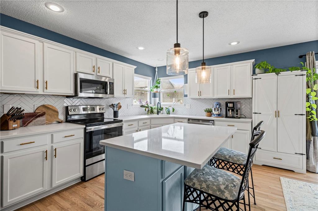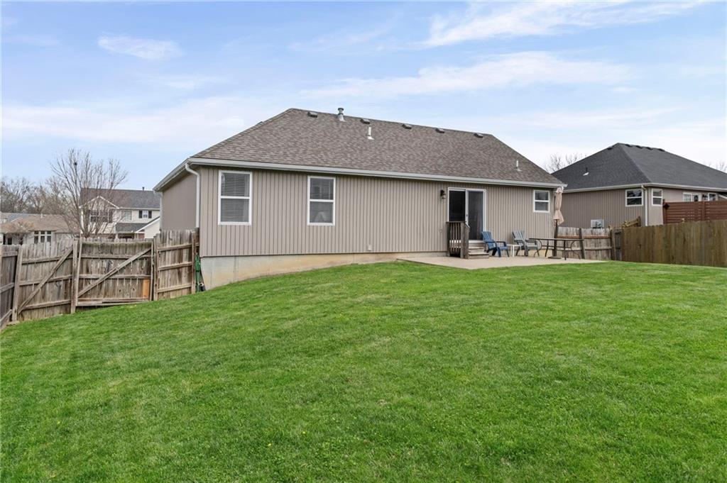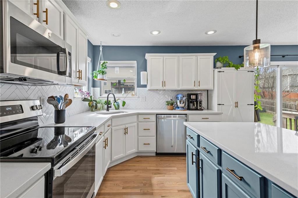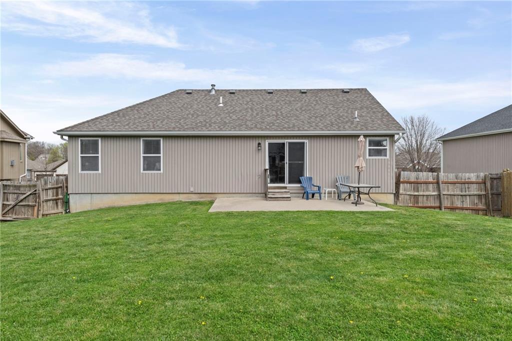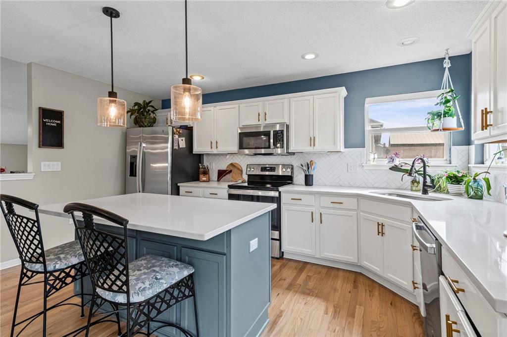 Beautiful 3-bedroom, 2-bath home in desirable Valley Hill Estates. The list of recent updates is endless. The kitchen features quartz countertops, a subway tile backsplash, painted cabinetry, and new stainless steel appliances. The dining area showcases refinished hardwood floors, a stylish accent wall, and access to the back patio through a sliding glass door. The inviting living room offers a vaulted ceiling and a tiled gas fireplace, creating a warm and open gathering space. The hall bathroom was fully renovated in 2024 with updated lighting, hardware, tile flooring, and a new vanity. Fresh interior paint and wallpaper add a modern touch throughout the home. Spacious primary suite includes a walk-in closet, double vanity, tiled shower, tray ceiling, shiplap accent wall, and updated fixtures. Major exterior improvements include a new roof, flashing, gutters, and downspouts, all completed in 2025. Located near Butterfly Trail and neighborhood pond, this home offers convenient access to outdoor recreation. Enjoy the charm of a quiet community with close proximity—just 2 miles—to shopping, dining, and amenities along Adams Dairy Parkway. Situated in the highly regarded Grain Valley School District with easy highway access. Don’t miss this exceptional opportunity to own a meticulously cared-for home.