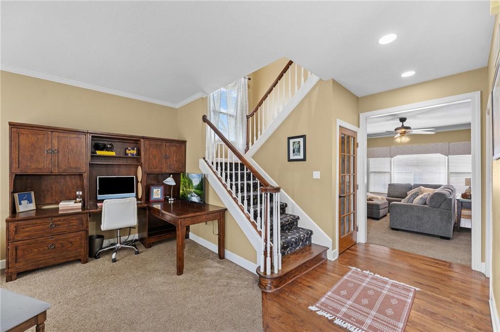 This 5-bedroom, 4.5-bath Lawrence home offers over 3,550 sqft with three living areas, double staircases, and generously sized bedrooms throughout. Abundant storage and smart home technology woven throughout the home, including an ADT system with indoor and outdoor cameras, smart doorbell, door and window sensors, a smart thermostat, smart garage door and Fiber internet, make everyday living as comfortable as it is connected. The main level features a formal dining room, an eat-in kitchen with an abundance of cabinet storage that creates an open, connected feel, and a large laundry room and mudroom with counter space and a sink. The primary suite is a true retreat, featuring a large bathroom and a dream walk-in closet. The 2nd floor also features another bedroom suite with full bathroom and two other bedrooms connected with a jack and jill bathroom. The partially finished basement adds versatility with a bedroom, full bathroom, and living area, while the unfinished portion provides plenty of room for storage. Out back, the expansive yard is a genuine highlight. A stamped concrete patio, new privacy fence with a 72" double wide gate, meticulously maintained grass, perennial landscaping, an apple tree, raspberry bushes, a playground, and a sprinkler system make this an outdoor retreat you will want to take full advantage of all season long. Conveniently located minutes from Target, Hy-Vee, and a wide variety of Lawrence dining and shopping, with easy access to K-10 for commuting to Kansas City or Topeka.