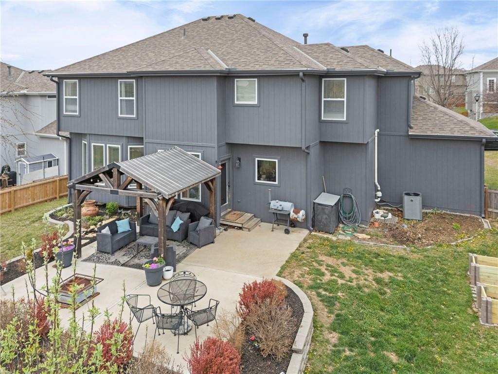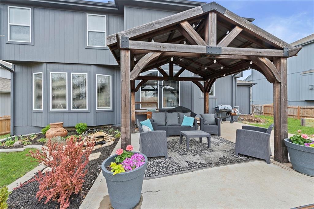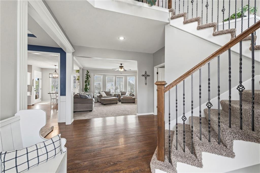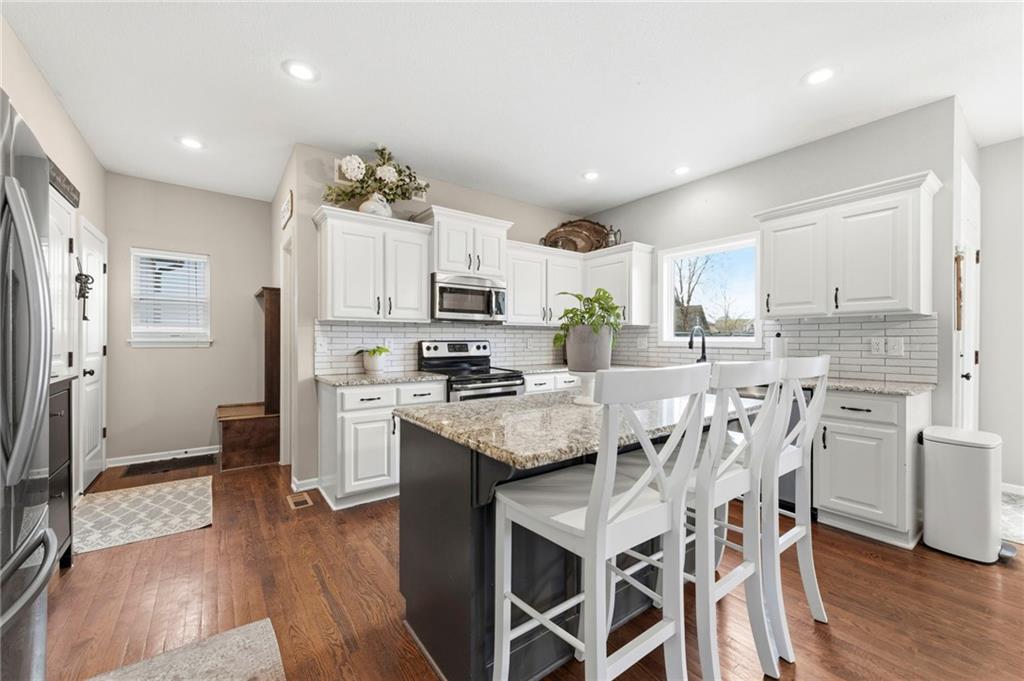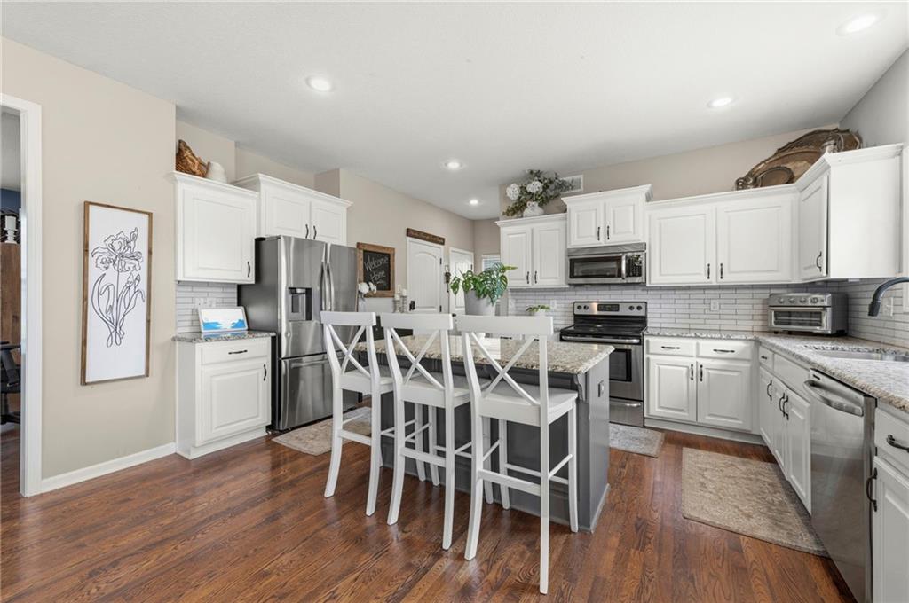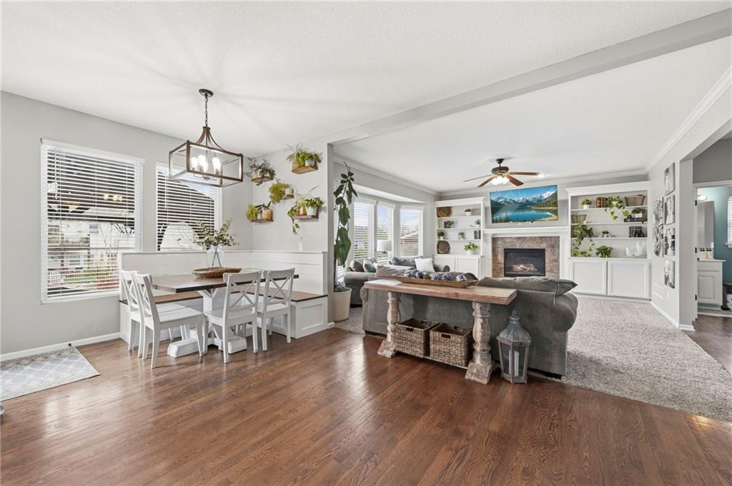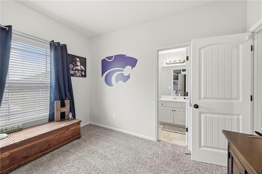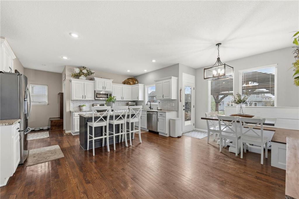 Open House Saturday, 4/18, 2p-5p. Why wait for a new build and pay more to get less? This 4-bedroom, 3.5-bath, 3-car garage home offers a spacious, open layout with ideal updates and is ready now! The beautifully updated kitchen features hardwood flooring, stainless steel appliances, granite countertops, an eat-in area with custom, built-in seating and table, and a large walk-in pantry. Just off the kitchen, enjoy a bright living room with fireplace and custom built-ins, plus a versatile dining room or office and convenient half bath. Upstairs, you’ll find the incredible primary suite featuring large ensuite and massive closet. Down the hall there are three additional bedrooms, a jack-and-jill bath, an additional full bath, and the convenience of second-floor laundry! The finished basement provides excellent additional living space with a bar area, under-stair play nook, a non-conforming bedroom or flex room, and plenty of storage space w/egress window. Step outside to a level backyard with mature landscaping and plenty of room for entertaining. Located just a short walk from neighborhood amenities including the pool, park, walking trails, and Lake Olathe. To make this even better, the roof and mechanicals are nearly new as well! A true full-package home—don’t miss it! Be sure to check out the virtual tour to fully appreciate the layout and space. Schedule your showing today.