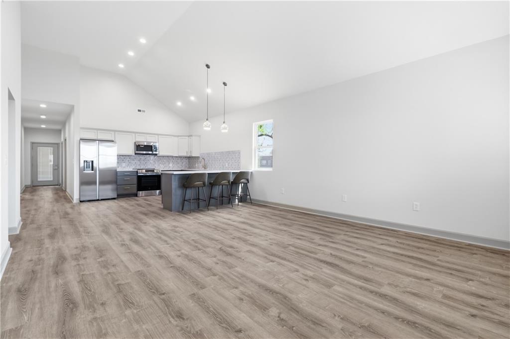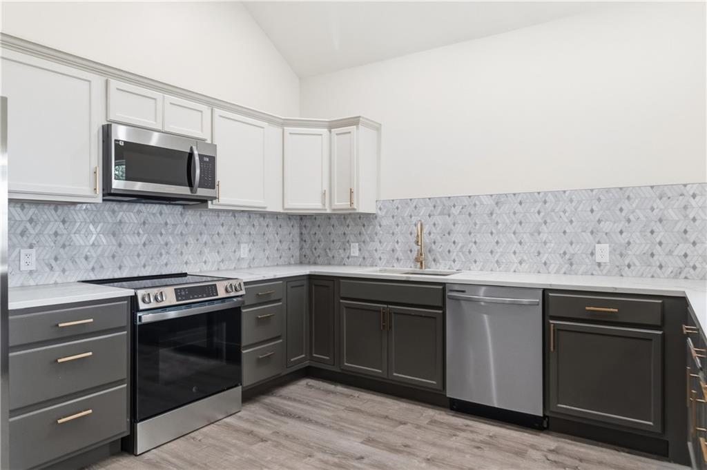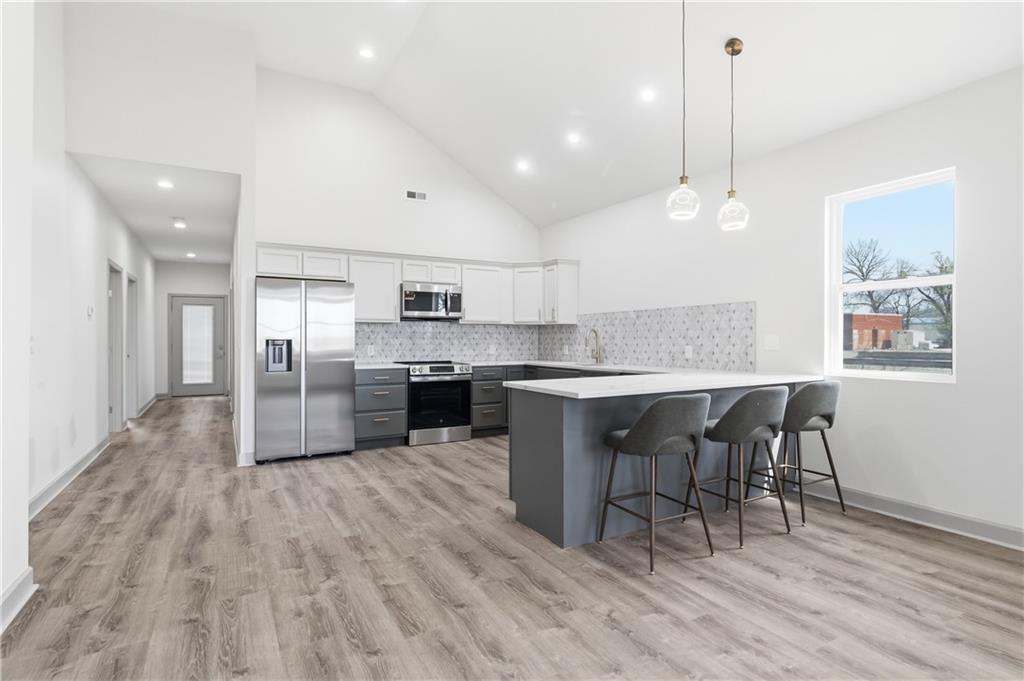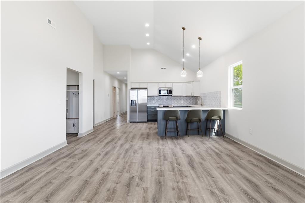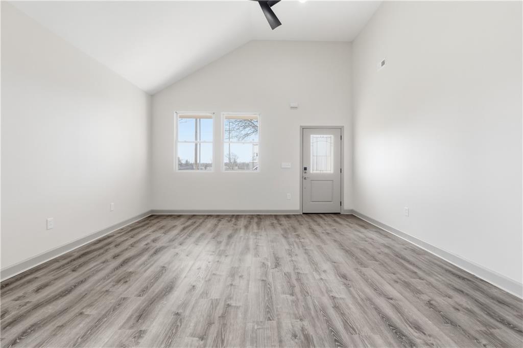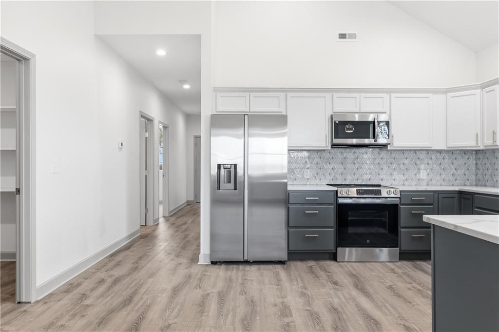 Welcome to this stunning brand-new construction home offering over 1,800 square feet of thoughtfully designed living space. This 3-bedroom, 2-bath home features a bright and open layout, highlighted by a spacious living room with impressive 16-foot vaulted ceilings and abundant natural light, while the remainder of the home offers comfortable 9-foot ceilings throughout. The modern kitchen is a true centerpiece, complete with sleek quartz countertops, a stylish marble backsplash, stainless steel appliances, and an oversized pantry providing ample storage. Durable and attractive LVP flooring flows seamlessly through the living, dining, and kitchen areas. The private primary suite serves as a relaxing retreat, featuring a spa-like bathroom with a double vanity, quartz countertops, and a beautifully tiled walk-in shower. The suite also includes a walk-in closet with built-in shelving for optimal organization. Each bedroom is equipped with ceiling fans for added comfort. Step outside to a brand-new deck, perfect for relaxing or entertaining. This is the one you’ve been waiting for—don’t let it slip away!