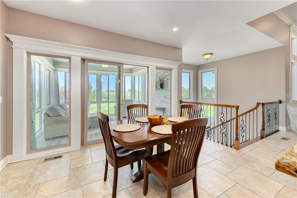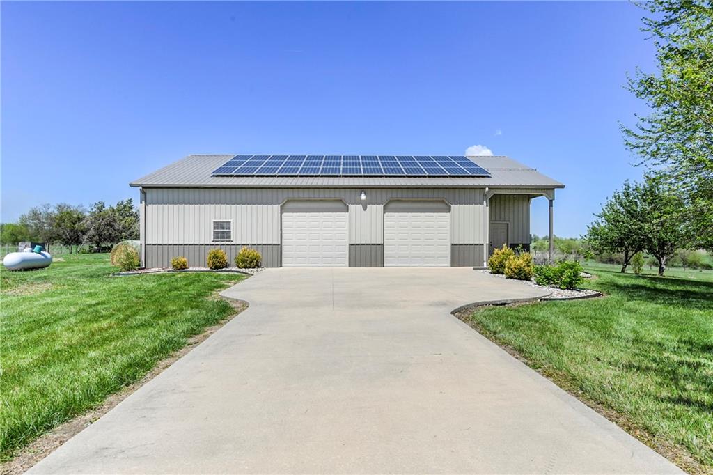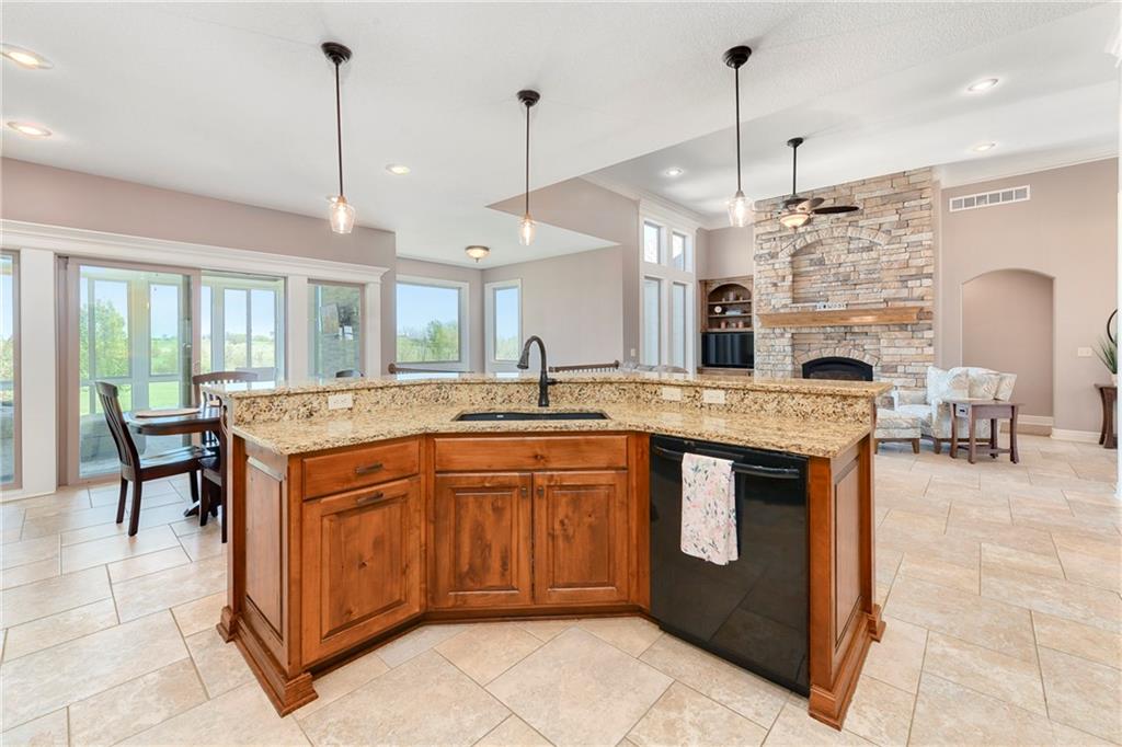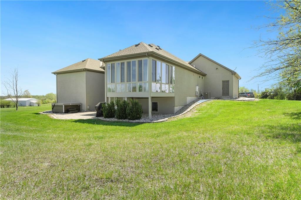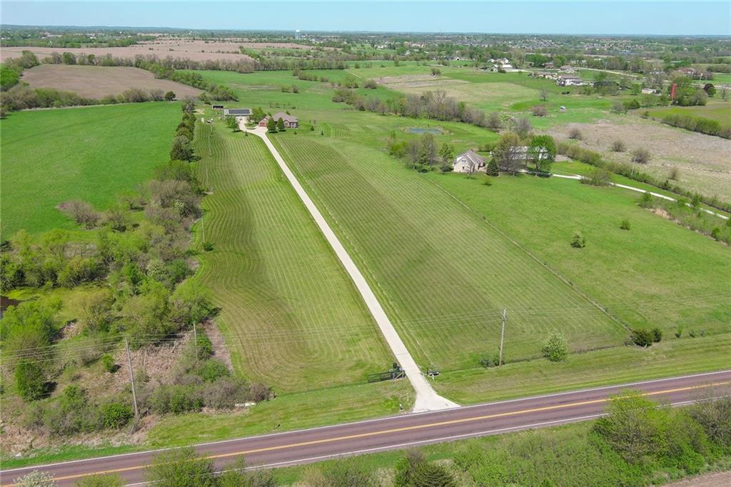 This stunning custom-built all-brick ranch sits majestically atop a hill, offering breathtaking views and the perfect blend of luxury and functionality. Designed for true main-level living, the home features three spacious bedrooms on the main floor. Two secondary bedrooms provide excellent flexibility for guests, family, or a home office—complete with abundant natural light and beautiful wood flooring. The expansive primary suite is a true retreat, easily accommodating large furniture and complemented by a spa-like ensuite featuring a walk-in shower, jetted soaking tub, double vanities, and an impressive walk-in closet. Enjoy both formal and casual living with a dedicated dining room and an open-concept kitchen equipped with a cooktop, granite countertops, stained wood cabinetry, and a large pantry. The kitchen flows seamlessly into the great room, where a striking stone fireplace and walls of windows showcase the property’s scenic surroundings. An enclosed four-season sunroom extends the living space, perfect for relaxing or entertaining year-round. Additional main-level conveniences include a drop zone off the garage, and a second laundry option in the pantry. The partially finished walk-out basement adds even more versatility with a fourth bedroom, full bathroom, family room, and a second laundry area. There is ample opportunity to expand, with space for two additional bedrooms and a fourth bathroom—featuring daylight windows for added comfort and value. Outside, the property truly shines with approximately 12 acres of agricultural land, plus an additional 2 acres surrounding the home. A massive 2,900 sq ft utility building includes solar power that saves tons on utility bills, ideal for a variety of uses. The property is fully fenced and secured with a grand electric entry gate. Enjoy the best of both worlds—peaceful country living with a prime location offering convenient access to everything the Kansas City area has to offer.