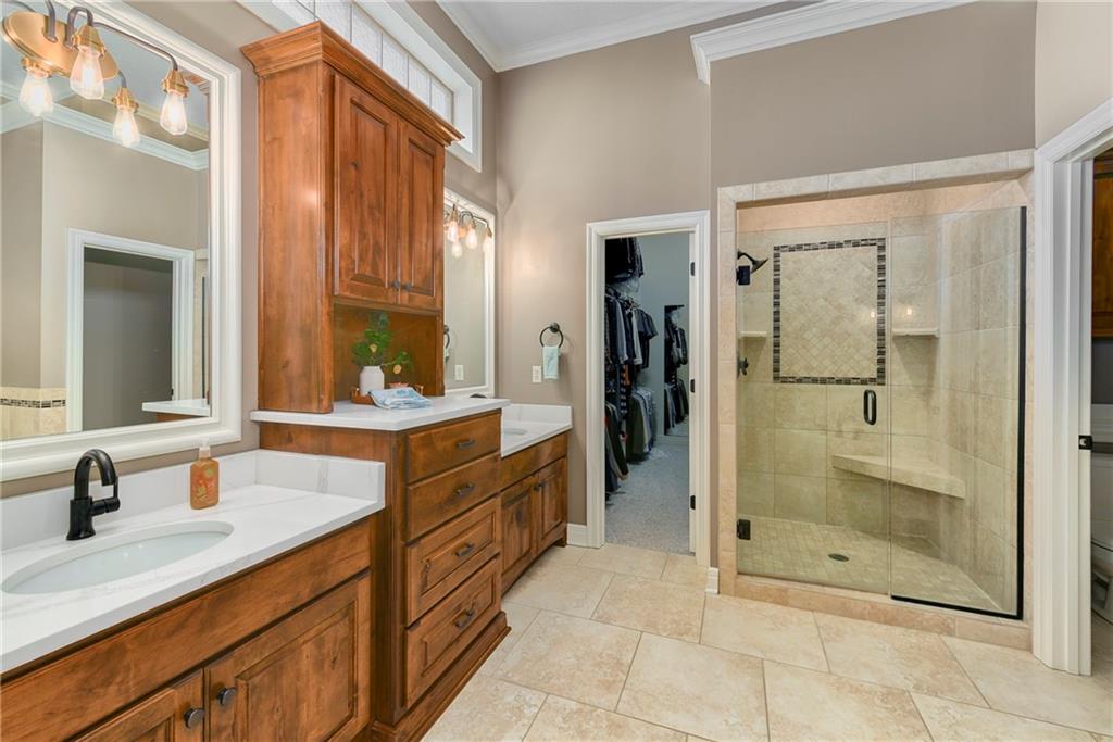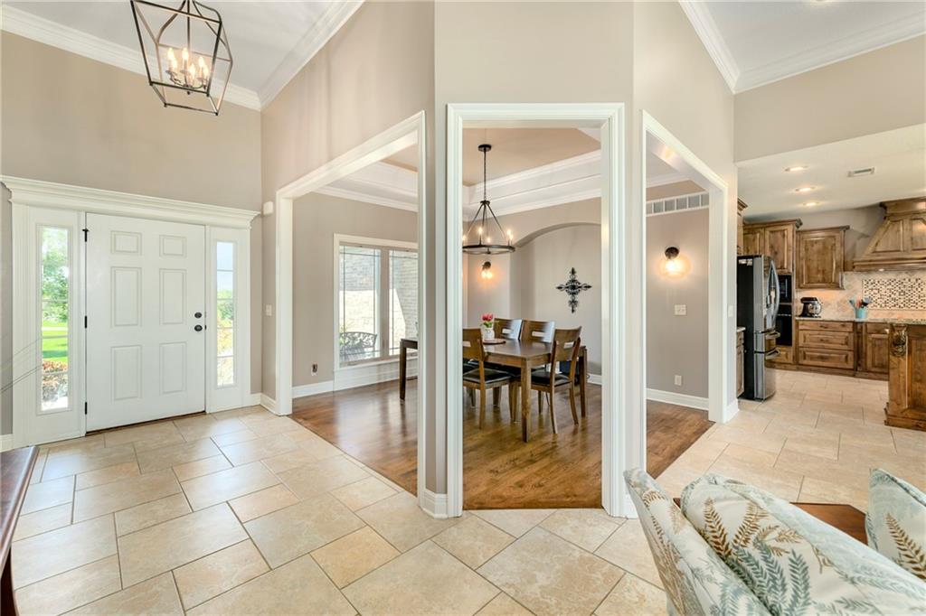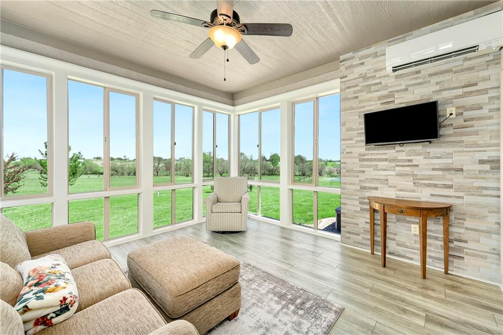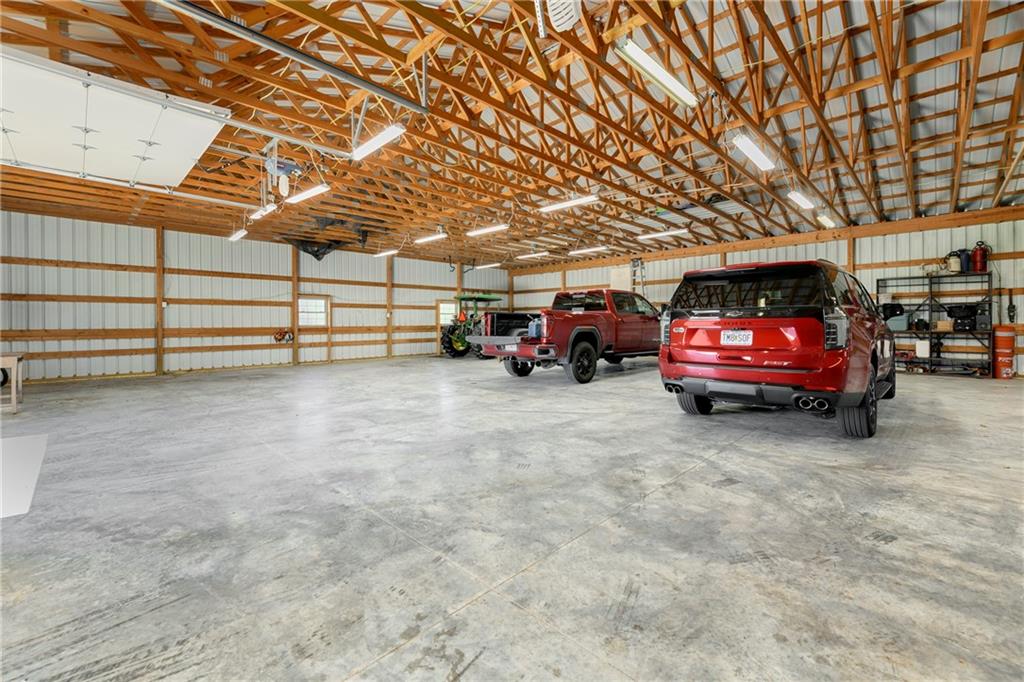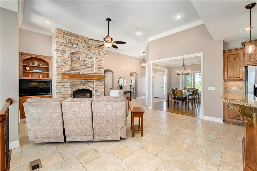 This stunning custom-built all-brick ranch sits majestically atop a hill, offering breathtaking views and the perfect blend of luxury and functionality. Designed for true main-level living, the home features three spacious bedrooms on the main floor. Two secondary bedrooms provide excellent flexibility for guests, family, or a home office—complete with abundant natural light and beautiful wood flooring. The expansive primary suite is a true retreat, easily accommodating large furniture and complemented by a spa-like ensuite featuring a walk-in shower, jetted soaking tub, double vanities, and an impressive walk-in closet. Enjoy both formal and casual living with a dedicated dining room and an open-concept kitchen equipped with a cooktop, granite countertops, stained wood cabinetry, and a large pantry. The kitchen flows seamlessly into the great room, where a striking stone fireplace and walls of windows showcase the property’s scenic surroundings. An enclosed four-season sunroom extends the living space, perfect for relaxing or entertaining year-round. Additional main-level conveniences include a drop zone off the garage, and a second laundry option in the pantry. The partially finished walk-out basement adds even more versatility with a fourth bedroom, full bathroom, family room, and a second laundry area. There is ample opportunity to expand, with space for two additional bedrooms and a fourth bathroom—featuring daylight windows for added comfort and value. Outside, the property truly shines with approximately 12 acres of agricultural land, plus an additional 2 acres surrounding the home. A massive 2,900 sq ft utility building includes solar power that saves tons on utility bills, ideal for a variety of uses. The property is fully fenced and secured with a grand electric entry gate. Enjoy the best of both worlds—peaceful country living with a prime location offering convenient access to everything the Kansas City area has to offer.