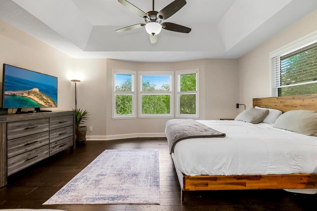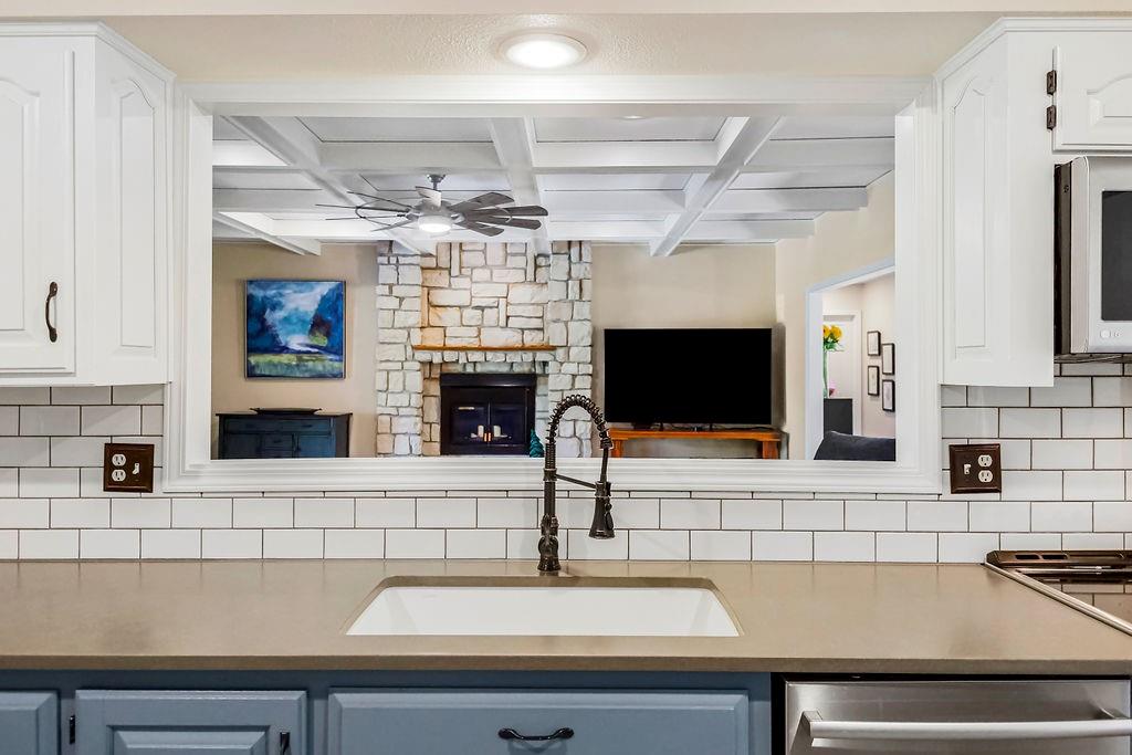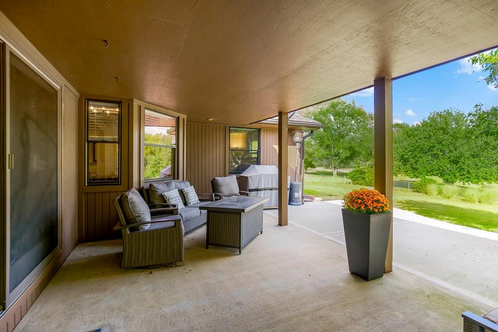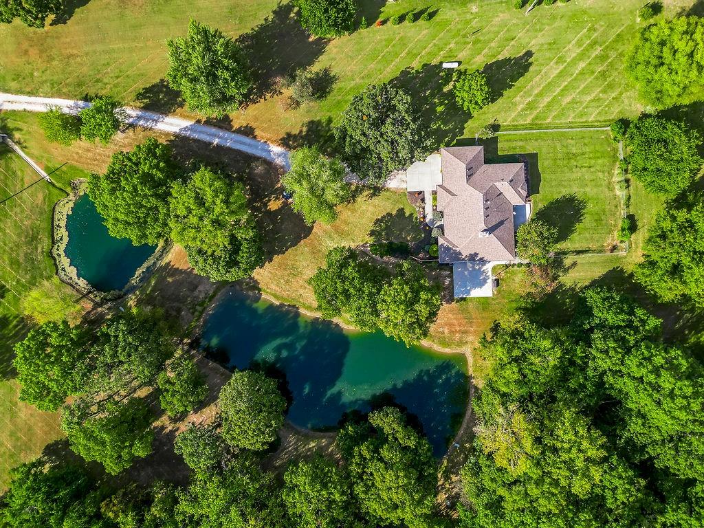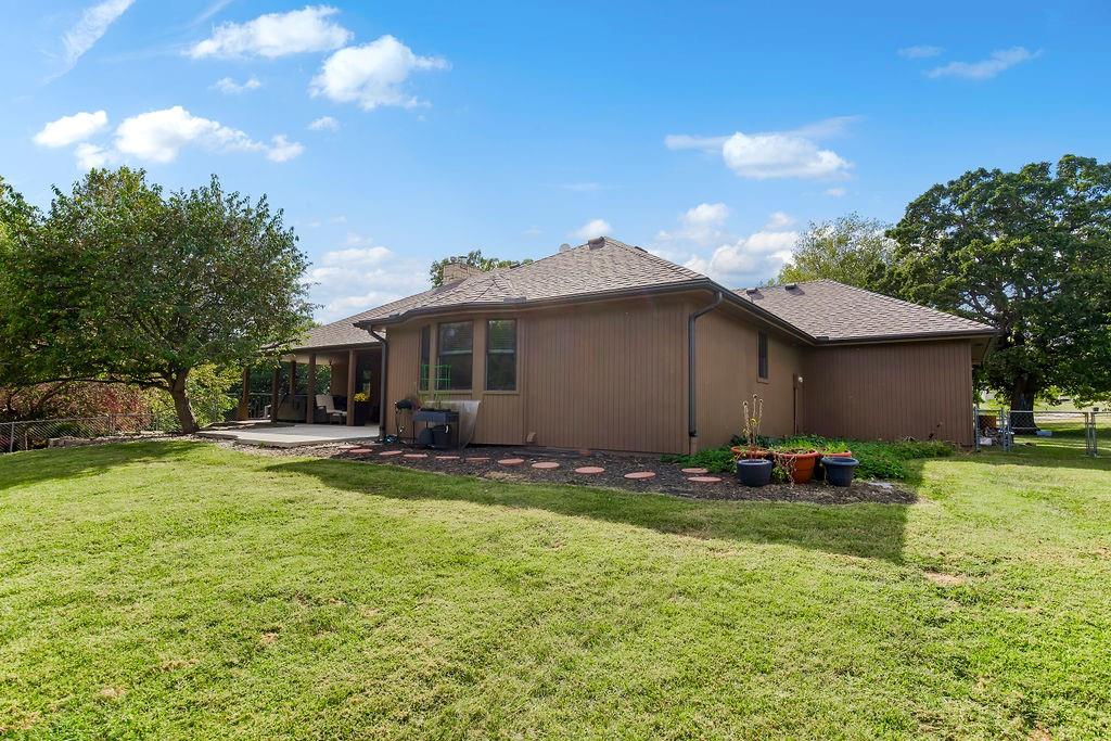 With over $50,000 in updates over the past several years and priced $15,000 UNDER a November 2025 appraisal value, this exquisitely renovated true ranch home set on 17.35 acres is a DREAM! Located within the Basehor-Linwood School District, this property is a nature lover's paradise, featuring abundant wildlife, two stocked ponds, scenic trails, and a creek with a bridge. The main level showcases a formal dining room, a spacious living room with beamed ceilings and a wood-burning fireplace, an updated kitchen with quartz countertops, new backsplash, updated flooring, new stainless-steel appliances, a pantry, and a cozy breakfast nook. Adjacent to the kitchen is the master suite with a walk-in closet, dual vanities, shower, and laundry room. For added privacy, there are two additional bedrooms and a full updated bath on the opposite side of the house. The lower level includes a family room, 4th bedroom, and half bath, with access to the garage/workshop, making it ideal for potential separate living quarters. The lower tandem garage workshop is equipped with AC and can accommodate 3 cars (additional 2-car garage on main level), with ample storage space available. The fenced backyard features a generously sized covered patio perfect for entertaining, relaxing in the hot tub, and enjoying the company of hummingbirds. With custom finishes throughout and recent updates that include a freshly painted interior, scraped ceilings, flooring, kitchen renovations, fixtures, and electrical/lighting, this home offers an absolutely tranquil setting just outside the city limits, where you can revel in the soothing sounds of nature.