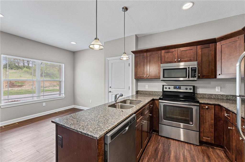 Rarely available 2-bedroom, 2.5-bath townhome in Villas of Stonebridge! This spacious, move-in-ready home offers the perfect blend of privacy, style, and true low-maintenance living. Inside, you’ll find granite countertops, stainless steel appliances, and large, bright windows that fill the home with natural light. The property has been well maintained and features brand new carpet and fresh paint throughout, ready for you to move right in! Step outside to your patio backing to greenspace and a wooded area, creating a peaceful setting ideal for morning coffee or evening relaxation. The HOA covers lawn care, landscaping, snow removal, exterior maintenance, and more, allowing for easy, worry-free living. Conveniently located with quick highway access and just minutes from The Legends, Kansas Speedway, and the future home of the Chiefs Stadium! Schedule your private showing today! (Investment opportunity available with the two neighboring units also for sale. Please reach out for additional details on a package purchase if interested)