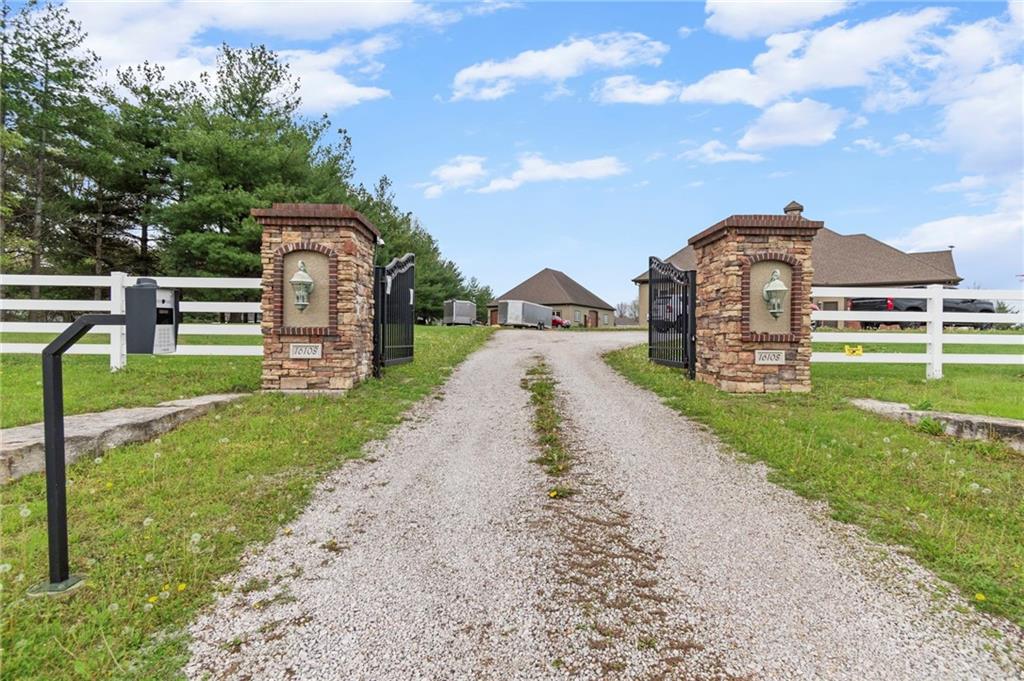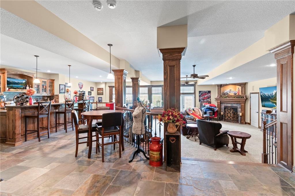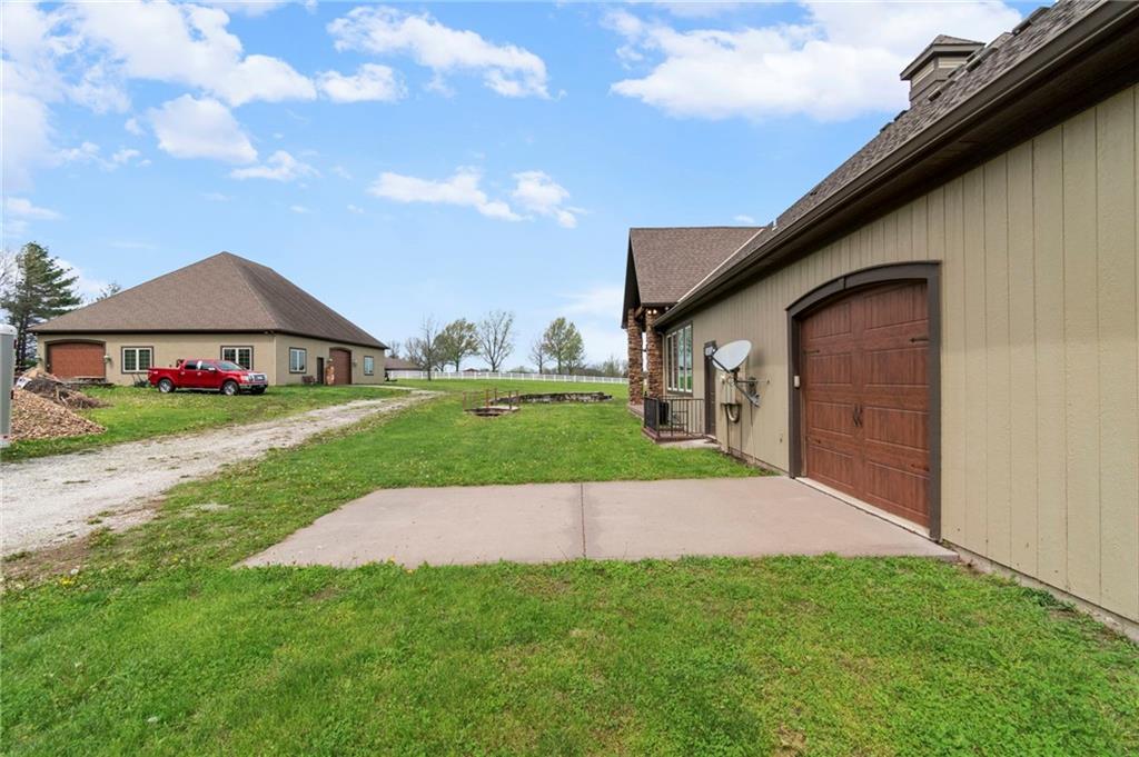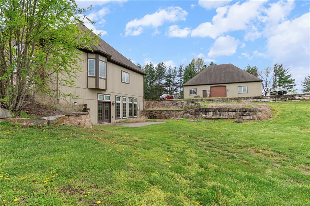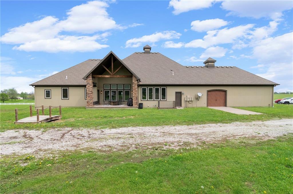 Set on nearly five acres just outside of town, this Kearney estate checks every box and then adds a few you didn’t know you needed. Inside, the main living space opens into a layout that feels open and intentional. The living room, dining area, and kitchen flow together seamlessly, anchored by hardwood floors and natural light. A fireplace with custom built-ins adds a focal point.The kitchen is built for real life and gatherings. Granite countertops, custom cabinetry, double wall ovens, and an oversized island make prep and hosting easy. A walk-in pantry keeps everything tucked away. The main level offers flexibility with a front room that can serve as a bedroom, formal dining space, or office. Two additional bedrooms share a well-designed bath with separate vanity areas. The primary suite is set apart, featuring a large walk-in closet and spa-like bath with soaking tub, tiled shower with dual heads, and double vanity. Laundry and a half bath complete the level. Downstairs, the finished lower level is built for hosting. A full wet bar with a large island opens into a second living area with its own fireplace. A private bedroom and bath make it ideal for guests or multi-generational living, along with a half bath and flexible space for a gym, office, or sixth non-conforming bedroom. Storage is extensive, with a suspended slab design offering approximately 55x31 of storage space, plus an additional 21x11 area that also functions as a secure storm shelter. The six-car attached garage provides plenty of space, and the detached 50x60 shop adds even more with its own office, bathroom, car wash, and paint bay, plus an unfinished upper level. Built with intention, the home features structural beams for wide open spaces, twelve-foot ceilings on both levels, geothermal heating, and energy-efficient windows. Mineral rights convey with the property, including oil and water discovered during the geothermal process and registered with the Missouri Department of Natural Resources.