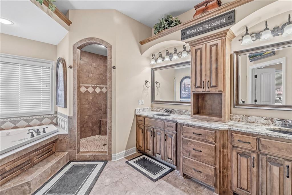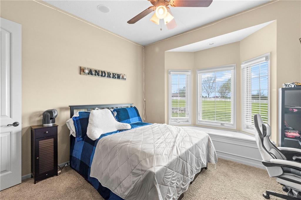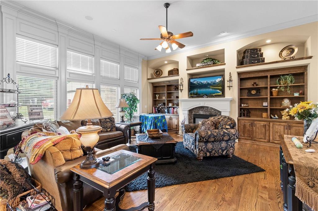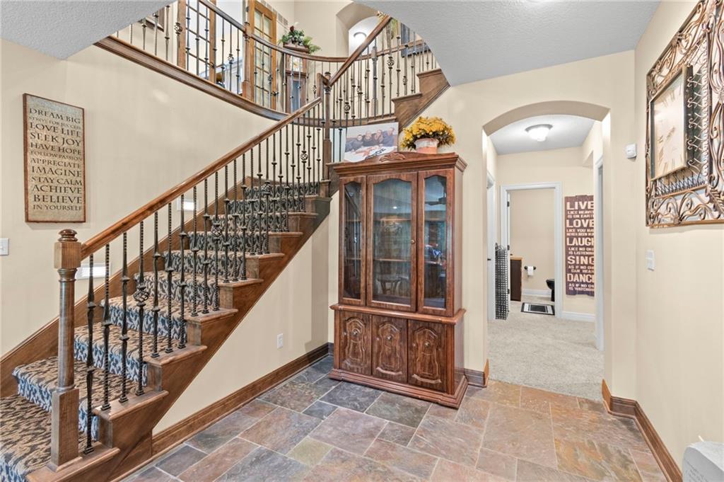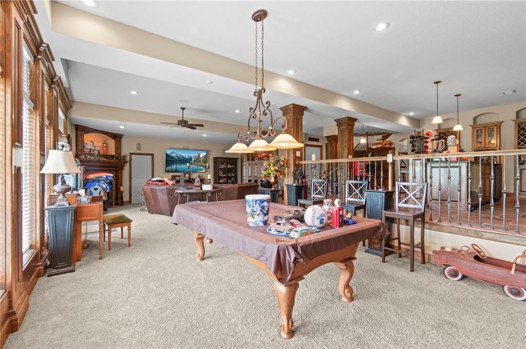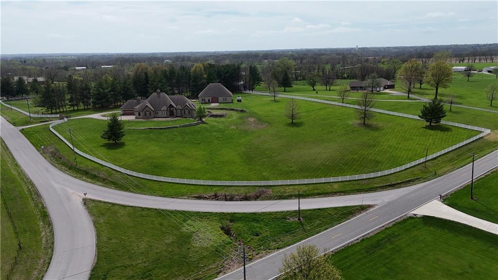 Set on nearly five acres just outside of town, this Kearney estate checks every box and then adds a few you didn’t know you needed. Inside, the main living space opens into a layout that feels open and intentional. The living room, dining area, and kitchen flow together seamlessly, anchored by hardwood floors and natural light. A fireplace with custom built-ins adds a focal point.The kitchen is built for real life and gatherings. Granite countertops, custom cabinetry, double wall ovens, and an oversized island make prep and hosting easy. A walk-in pantry keeps everything tucked away. The main level offers flexibility with a front room that can serve as a bedroom, formal dining space, or office. Two additional bedrooms share a well-designed bath with separate vanity areas. The primary suite is set apart, featuring a large walk-in closet and spa-like bath with soaking tub, tiled shower with dual heads, and double vanity. Laundry and a half bath complete the level. Downstairs, the finished lower level is built for hosting. A full wet bar with a large island opens into a second living area with its own fireplace. A private bedroom and bath make it ideal for guests or multi-generational living, along with a half bath and flexible space for a gym, office, or sixth non-conforming bedroom. Storage is extensive, with a suspended slab design offering approximately 55x31 of storage space, plus an additional 21x11 area that also functions as a secure storm shelter. The six-car attached garage provides plenty of space, and the detached 50x60 shop adds even more with its own office, bathroom, car wash, and paint bay, plus an unfinished upper level. Built with intention, the home features structural beams for wide open spaces, twelve-foot ceilings on both levels, geothermal heating, and energy-efficient windows. Mineral rights convey with the property, including oil and water discovered during the geothermal process and registered with the Missouri Department of Natural Resources.