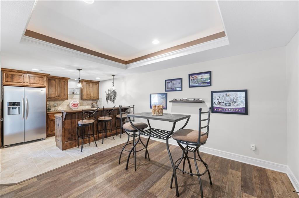 Welcome to this stunning former model home by James Engle Homes, showcasing the highly sought-after Emery reverse floor plan and loaded with gorgeous upgrades throughout. This beautifully designed 4-bedroom home offers the perfect blend of luxury and functionality. The main level features a spacious, light-filled great room with rich wood flooring and a striking see-through stone fireplace that extends to the covered, maintenance-free deck—creating a warm and inviting atmosphere both indoors and out. The gourmet kitchen is equally impressive, complete with granite countertops, double ovens, and a generous walk-in pantry, making it perfect for everyday living and entertaining. The luxurious primary suite offers a private retreat with dual vanities and a custom-tiled walk-in shower. The finished walkout/walkup lower level expands your living space with a large rec room, wet bar, two additional bedrooms, and a full bath—ideal for guests or entertaining. Step outside to enjoy exceptional outdoor living, including the covered deck with fireplace access and a beautifully designed stone patio with a fire pit, all backing to a serene tree line for added privacy. Additional highlights include a newer roof (just 2 years old) and access to fantastic neighborhood amenities, including a community pool. This home truly offers comfort, style, and convenience—don’t miss your opportunity to make it yours!