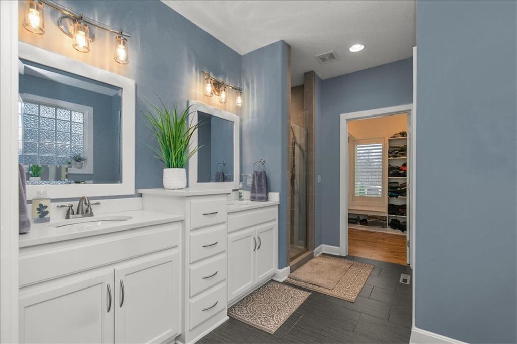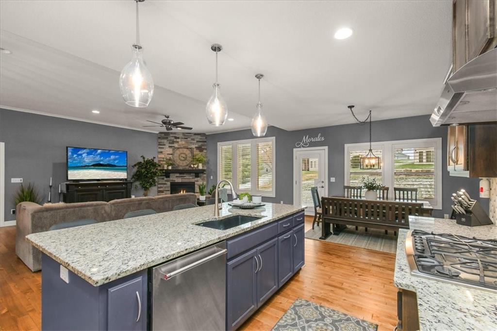 Prepare to be absolutely wowed by this ranch-style architectural masterpiece, a turnkey property where contemporary design meets luxurious, comfortable living. The home immediately impresses with its stunning façade of textured stucco and stacked stone accents, setting a sophisticated tone from the curb. Step inside onto gleaming hardwood floors that guide you through the expansive, open-concept design, flooded with natural light from oversized windows, most accented with custom plantation shutters. The heart of the home is the gourmet kitchen, a true chef's dream, showcasing rich, dark wood cabinetry equipped with soft close cabinets throughout, sleek granite countertops, and a show-stopping dark gray center island with seating—perfect for hosting and entertaining. Transition from the kitchen to the bright dining area and the spacious living room, anchored by a magnificent corner stone fireplace for cozy evenings. Retreat to the main floor private sanctuary in the primary suite, an oasis of calm with a stylish blue accent wall and an elegant tray ceiling that adds grandeur. The spa-like en-suite boasts a sleek double vanity with crisp white cabinetry, a glass-enclosed walk-in shower, and leads into a custom walk-in closet with ample built-in organization. Adding to the home's impressive functionality is a main-floor laundry room with gorgeous dark wood cabinetry, offering maximum convenience, complemented by a central vacuum system. For outdoor enjoyment, step onto the covered back patio, ideal for al-fresco dining or relaxing with a ceiling fan overhead. Below, the vast, unfinished basement presents a phenomenal opportunity to customize and expand—a blank canvas for adding a future home gym, theater, or additional living space to create your ultimate dream home. This is more than a home; it's an uncompromising quality lifestyle awaiting its new owner in a coveted community with excellent highway access for a convenient commute.