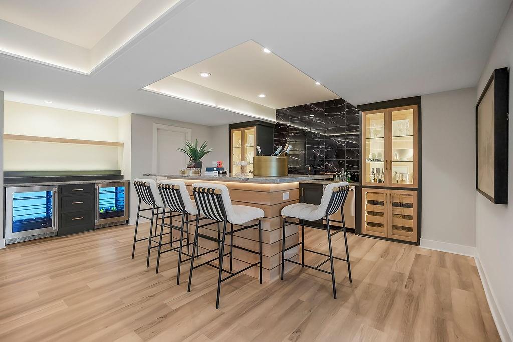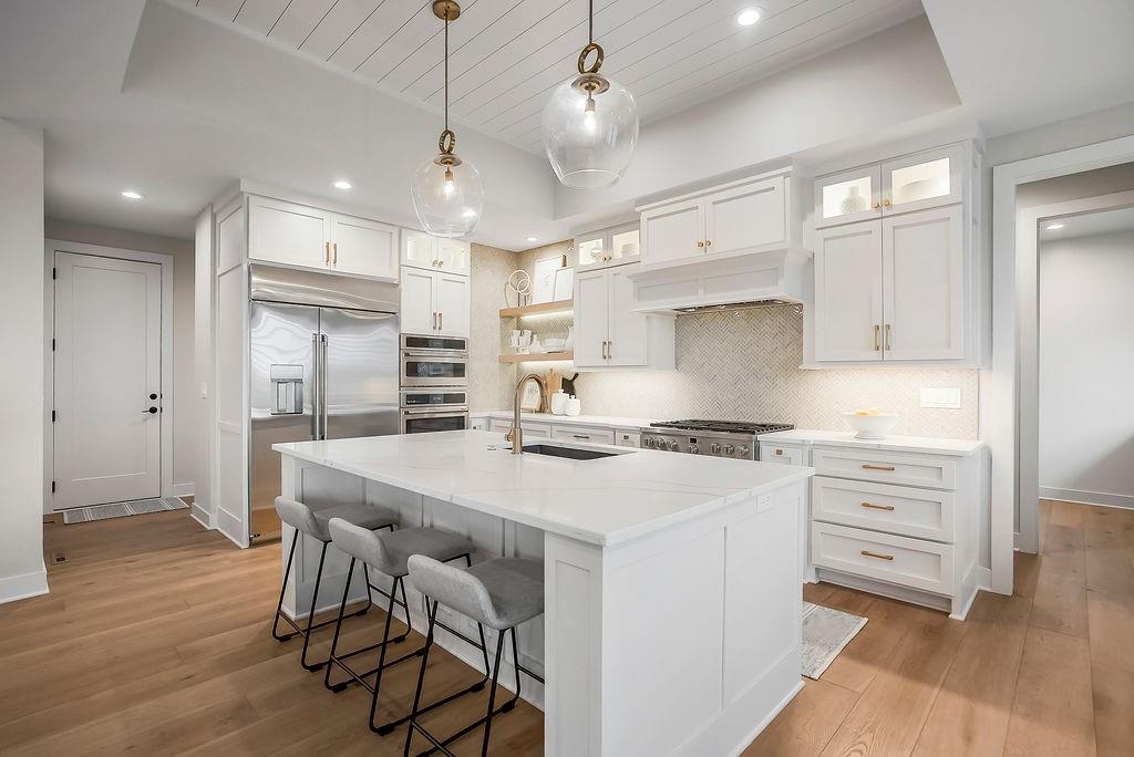 Like New and perfectly positioned on a premium lot backing to the award-winning Shadow Glen Golf Course, this stunning reverse 1.5-story home offers the ideal blend of luxury, comfort, and thoughtful design. With 5 bedrooms and 4 full baths, this home is crafted with beautiful details throughout. The main level features a spacious primary suite with a spa-like feel, complete with a walk-in closet that conveniently connects to the laundry room. Two additional bedrooms are located on the main level, including one with its own private bath—perfect for guests or a home office. The heart of the home showcases a large quartz-topped island, expansive pantry, and open living spaces designed for both everyday living and entertaining. The walkout lower level is an entertainer’s dream, featuring a full bar area, generous recreation room, plus two additional bedrooms and a full bath. You’ll also find two separate storage areas, including a storm shelter for added peace of mind. Step outside to take in sweeping golf course views overlooking Hole #5, creating a serene and picturesque backdrop. Whether hosting gatherings or enjoying a quiet evening at home, this property offers the perfect setting. Welcome home.