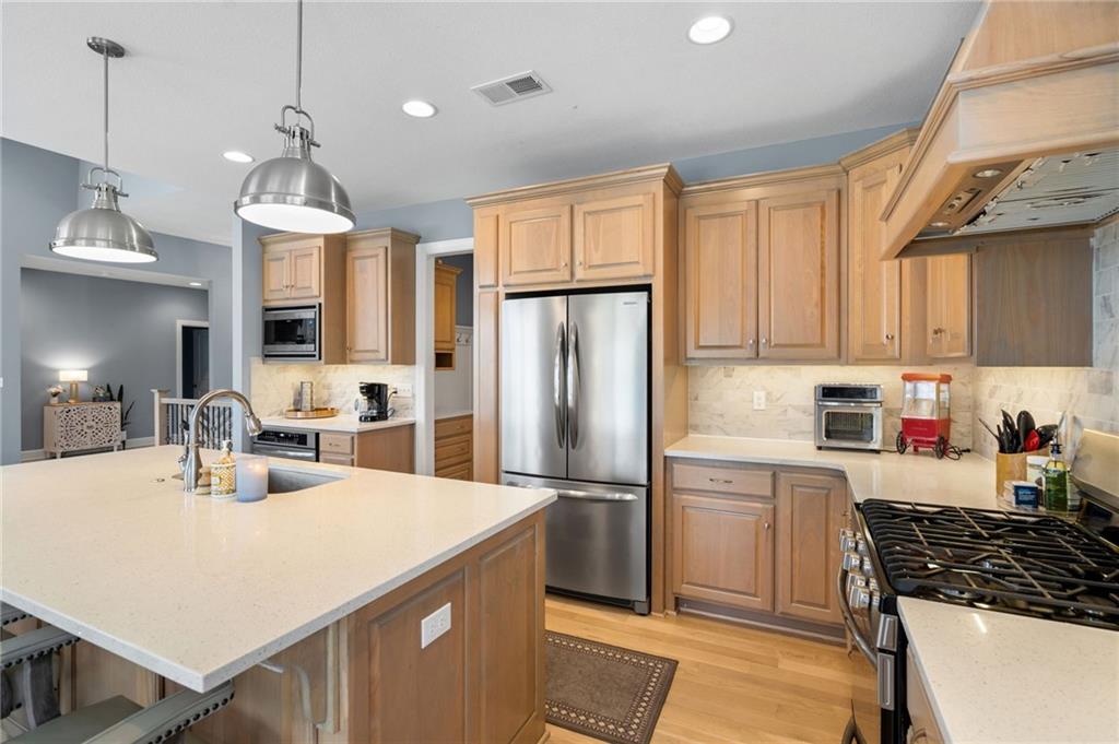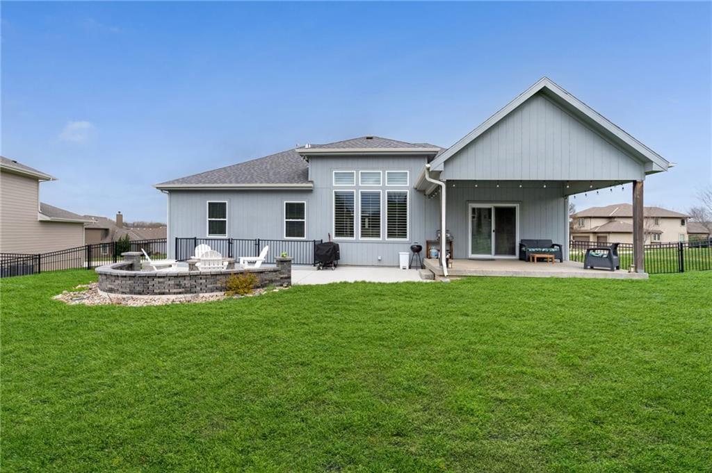 Stunning Ranch/Reverse home that features beautiful wood floors on the main level, open floor plan and kitchen with granite countertops, kitchen island, stainless appliances including a gas cook top that all remain with the home, white cabinets and pantry. Spacious primary suite that provides a wonderful walk in closet with lots of space, adjoining bathroom that features a double vanity, multi-headed shower and tiled floors. Finished basement with large rec room with wet bar and two additional bedrooms. Enjoy your fenced in backyard with a large patio space that is great for entertaining and includes a fire pit. Hurry this one will not last long!!!