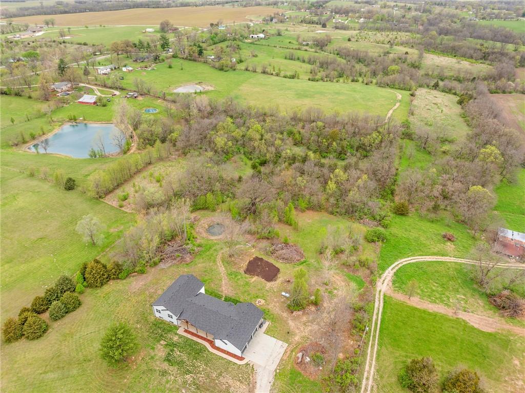 Start your mornings on the expansive 48-foot covered front porch, coffee in hand, as the quiet of the countryside and sweeping views ease you into the day. Set on 4.84± acres, featuring a beautiful newer home, this property offers a rare sense of space and privacy—perfect for those craving a slower pace without giving up convenience. Inside, thoughtful design meets everyday luxury. The open-concept floor plan is both inviting and functional, centered around a gourmet kitchen featuring custom white oak cabinetry, quartz countertops, double ovens, a Butler’s pantry, appliance lift, and an impressive 10-foot island—perfect for gathering. The adjoining family room is filled with natural light and anchored by a cozy gas fireplace. Upstairs, you’ll find generously sized bedrooms, including a serene primary suite retreat with a spa-inspired bath showcasing a 10-foot dual-head shower. Tucked beyond the expansive primary closet is a hidden office or flex space—ideal for working from home or a private escape. The finished walkout lower level offers even more room to live and entertain with 9-foot ceilings, two additional bedrooms, a full bath, and a large rec room. A substantial 8-foot concrete storm shelter provides peace of mind, while abundant storage keeps everything organized-1,600 square feet of unfinished endless potential. Car enthusiasts and pet lovers alike will appreciate the extended three-car garage with built-in dog wash. Out back, the elevated deck overlooks your acreage, with a concrete pad below already in place for a future hot tub—just imagine the evenings. With fiber internet, wide-open space, and endless possibilities, this property delivers the best of both worlds: modern comfort and the freedom of country living. Located 30 minutes to the Kansas City International airport and 35-40 minutes to downtown Kansas City. A rare opportunity to own acreage without compromise—offering endless potential to make it truly your own.